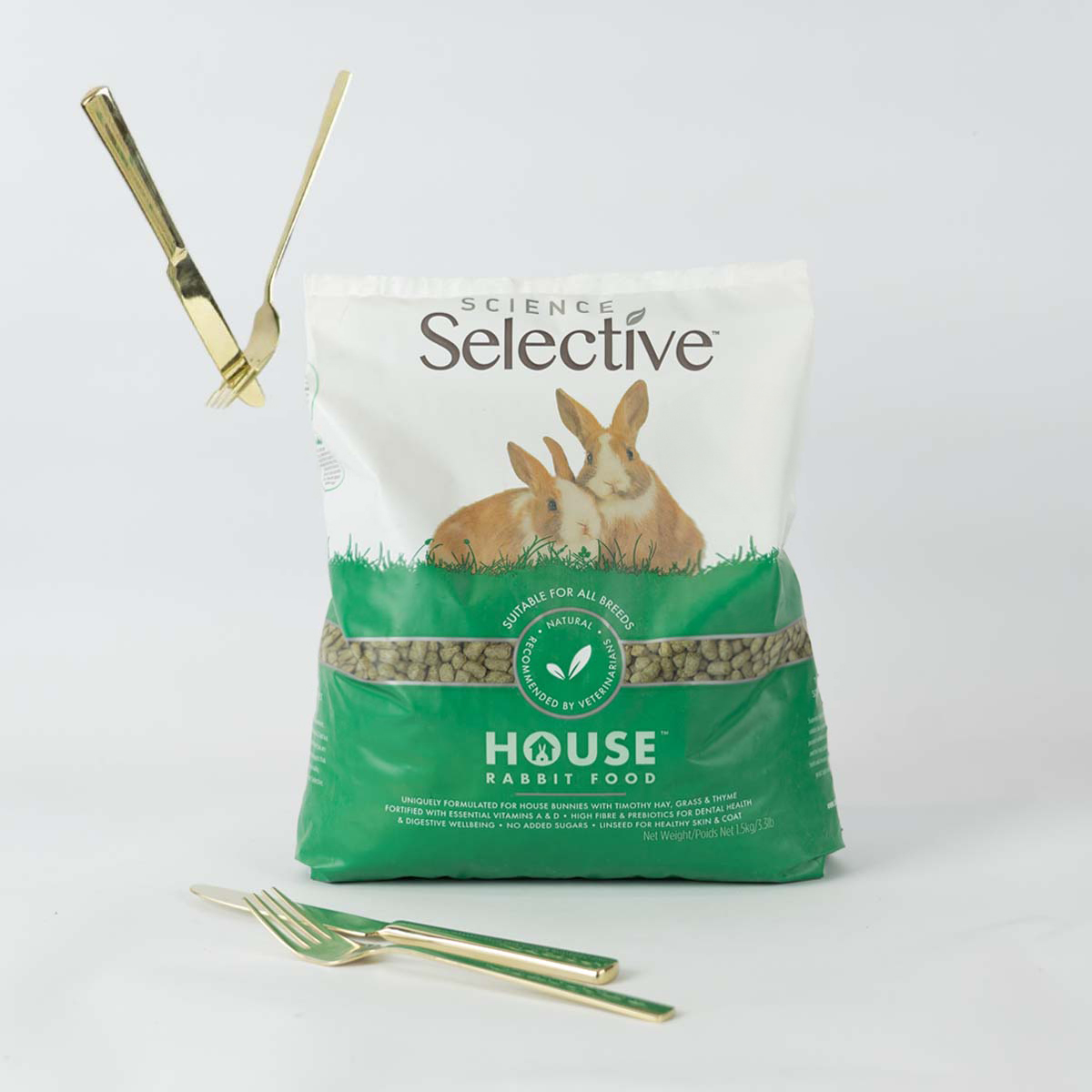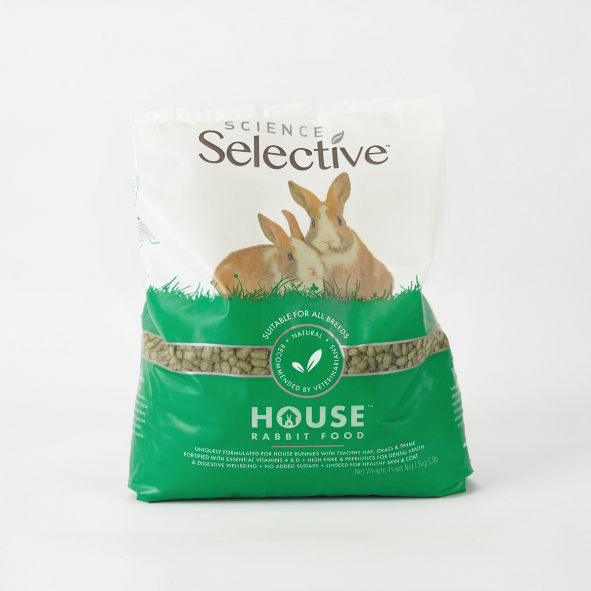 20 gram Science Selective House Rabbit brokken per kg streefgewicht per dag. Verdeel het voer over 2 maaltijden.