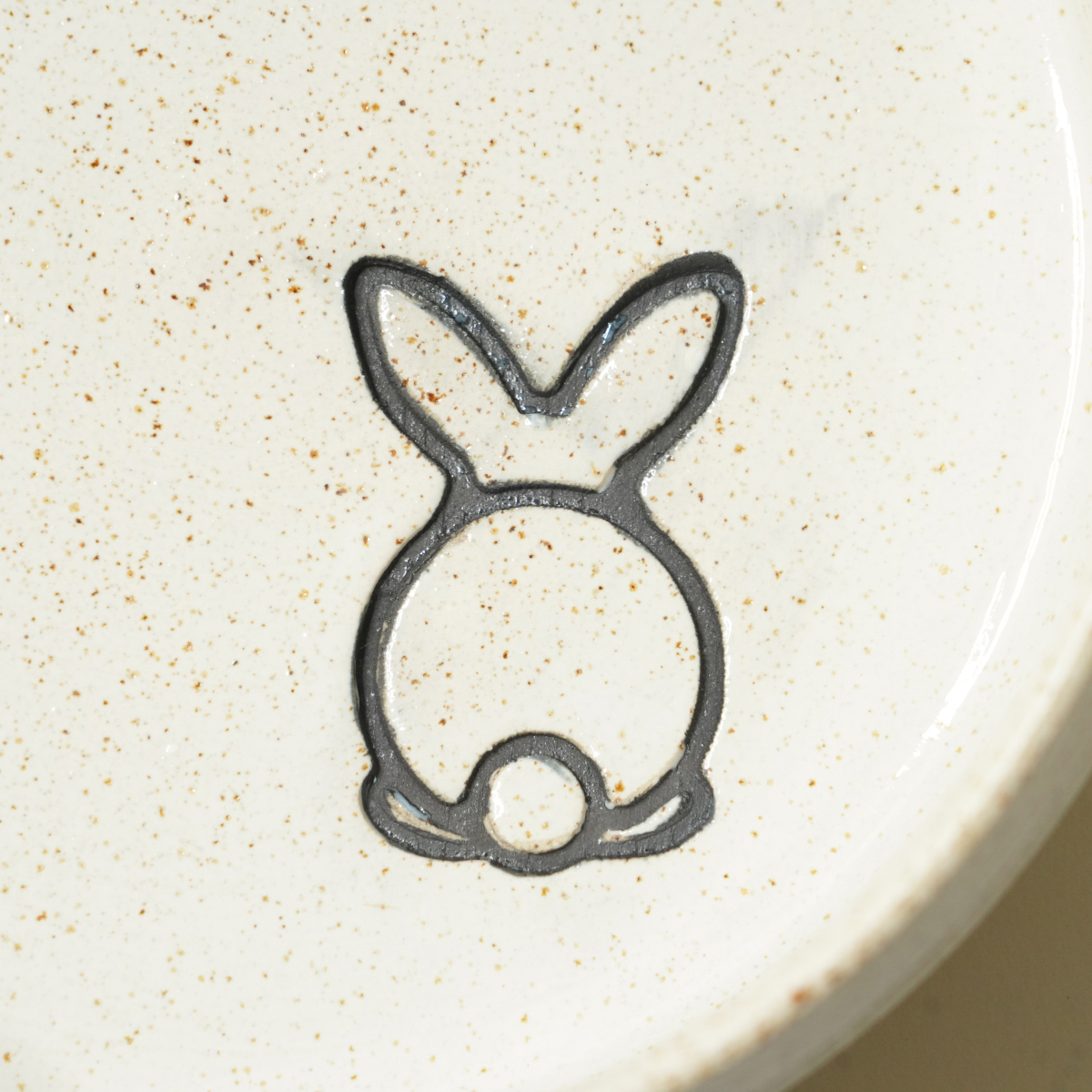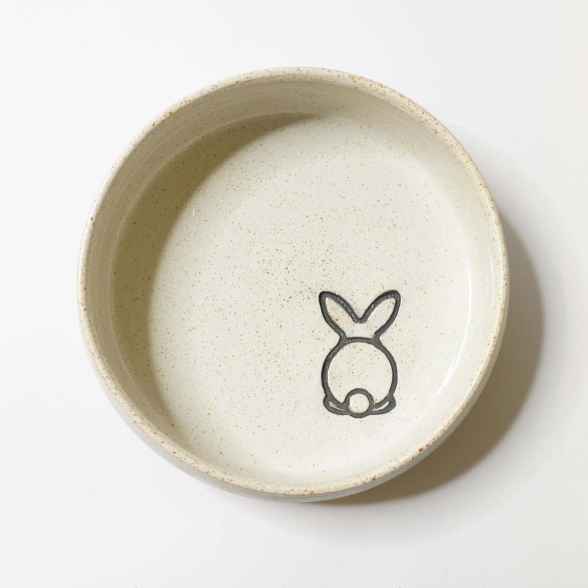 De voer- en drinkbak is gedraaid van een spikkelklei en voorzien van een wit glazuur.