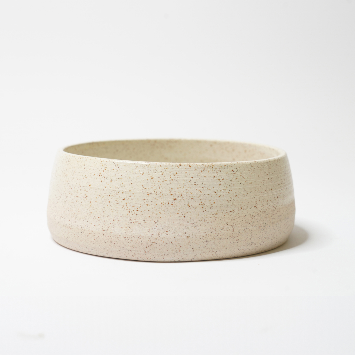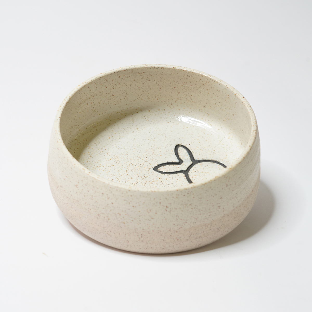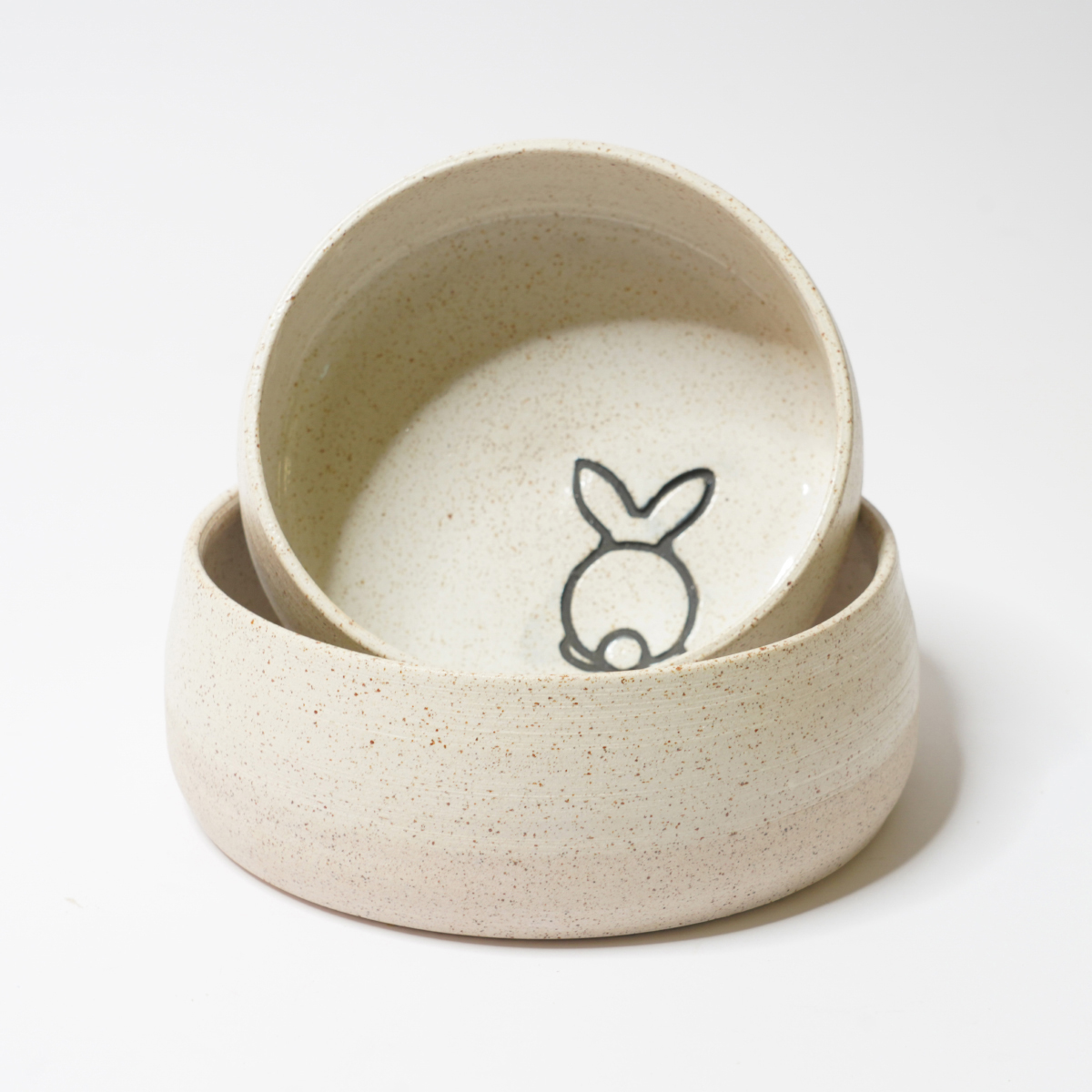 De eet- en drinkbak is gedraaid van een spikkelklei en voorzien van een wit glazuur.