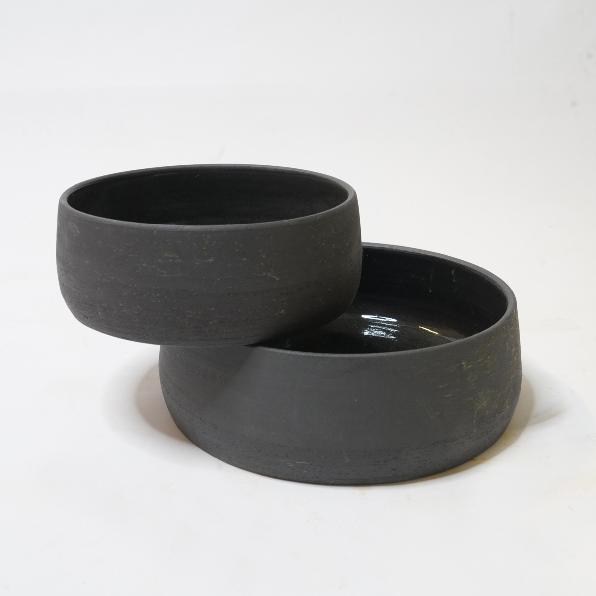 De eet- en drinkbak is gedraaid van Nigra klei en voorzien van een glazuur.