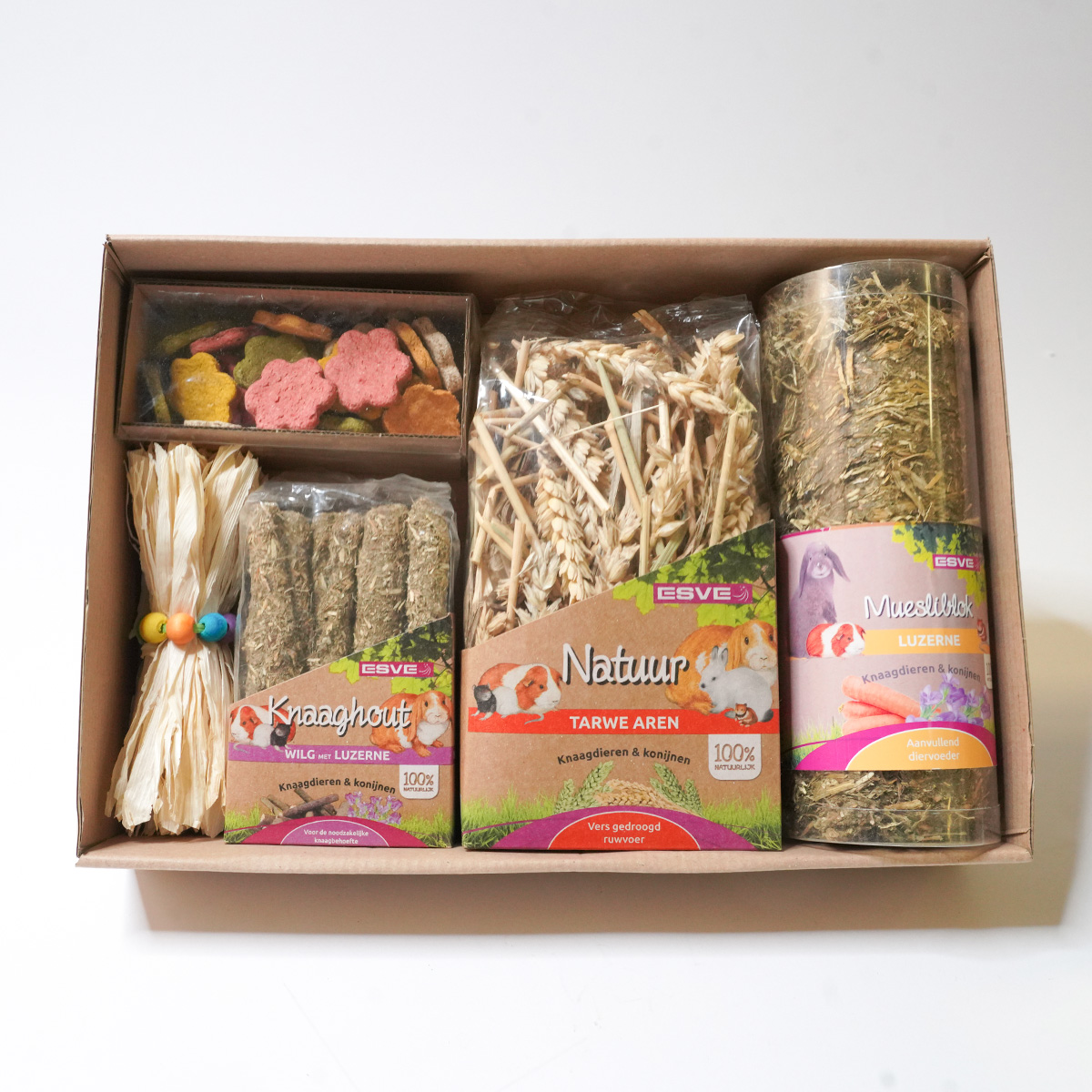 Crispy corn toy, cookie mix (assorti), knabbelhout wilg met luzerne, tarwe aren, muesliblok luzerne