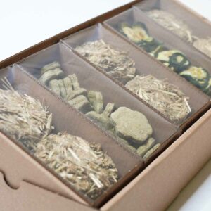 De Amber box is gevuld met 5 natuurlijke snacks met o.a. wortel hay rondo’s en gedroogde wortelstukjes. Heerlijk als snack, tussendoortje of traktatie.