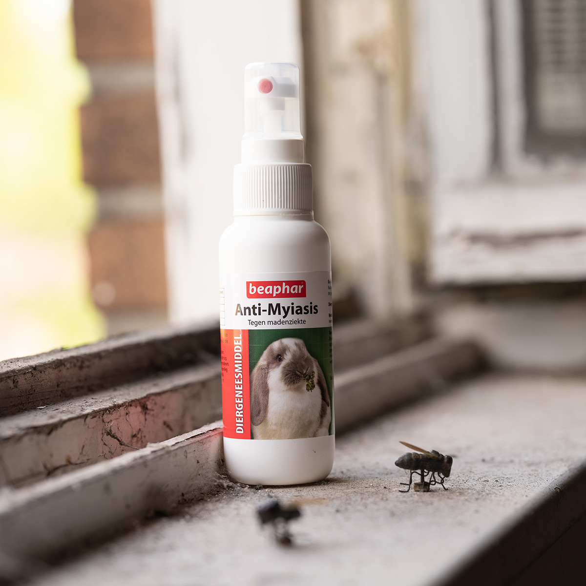 De Anti-myiasis spray van Beaphar is voor de preventie van Myiasis (madenziekte) bij konijnen, veroorzaakt door de blauwgroene bromvlieg.