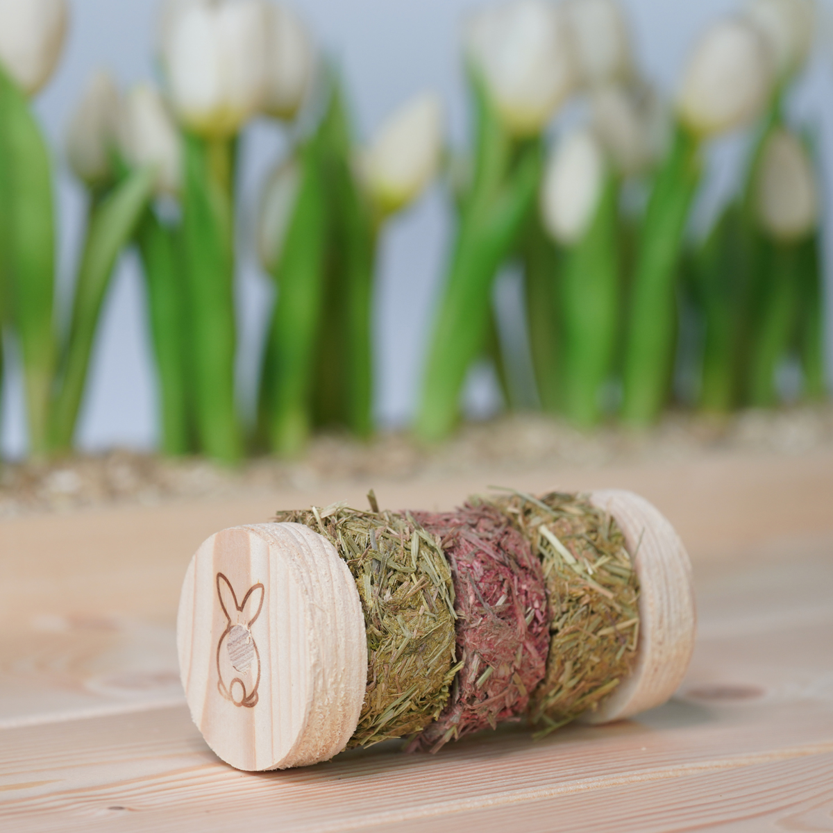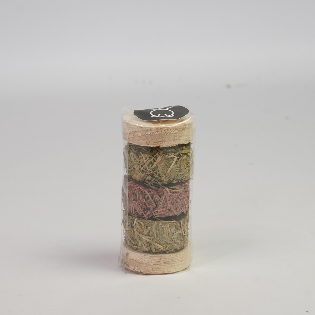 Deze toy is speciaal gemaakt voor onze zeer geliefde hay rondo’s. De hay rondo’s zijn gemaakt met een gat, zodat je deze in het houten spel kunt bevestigen. Zo kan jouw konijn heerlijk spelen, gooien en ondertussen ook nog genieten van de hooi schijven, gemaakt van hooi met rode biet, wortel en spinazie.