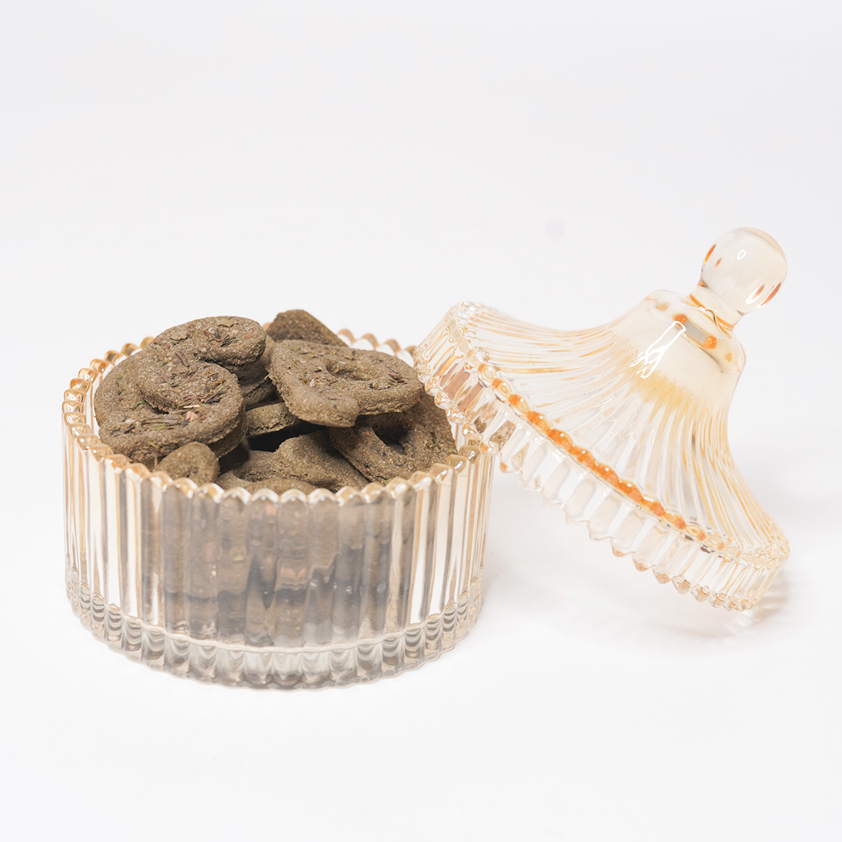 Verras jouw konijn met een feestelijke traktatie in stijl. Deze verfijnde glazen bonbonnière straalt pure elegantie uit en is gevuld met ambachtelijke S en P koekjes, speciaal voor jouw konijn.