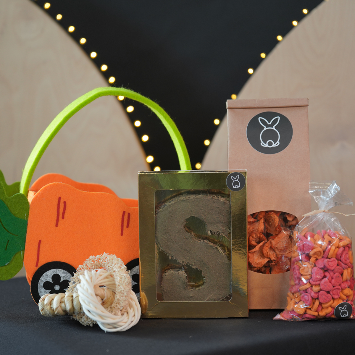 Dit schattige vilten wortelmandje zit boordevol lekkers en een speeltje om naar hartenlust te knabbelen en te spelen.