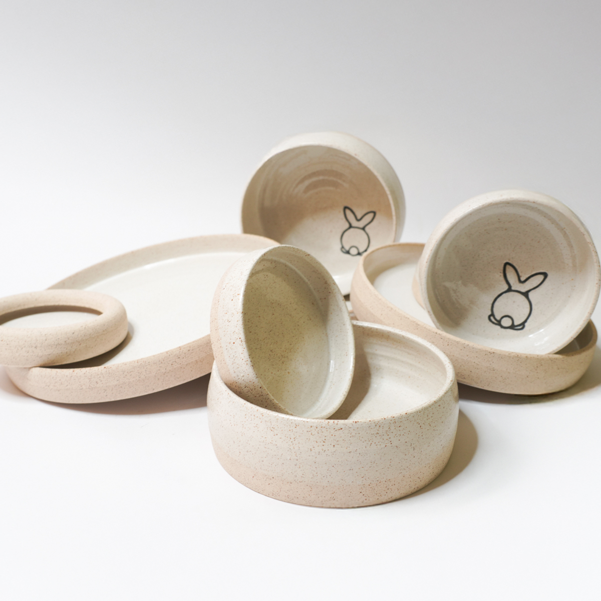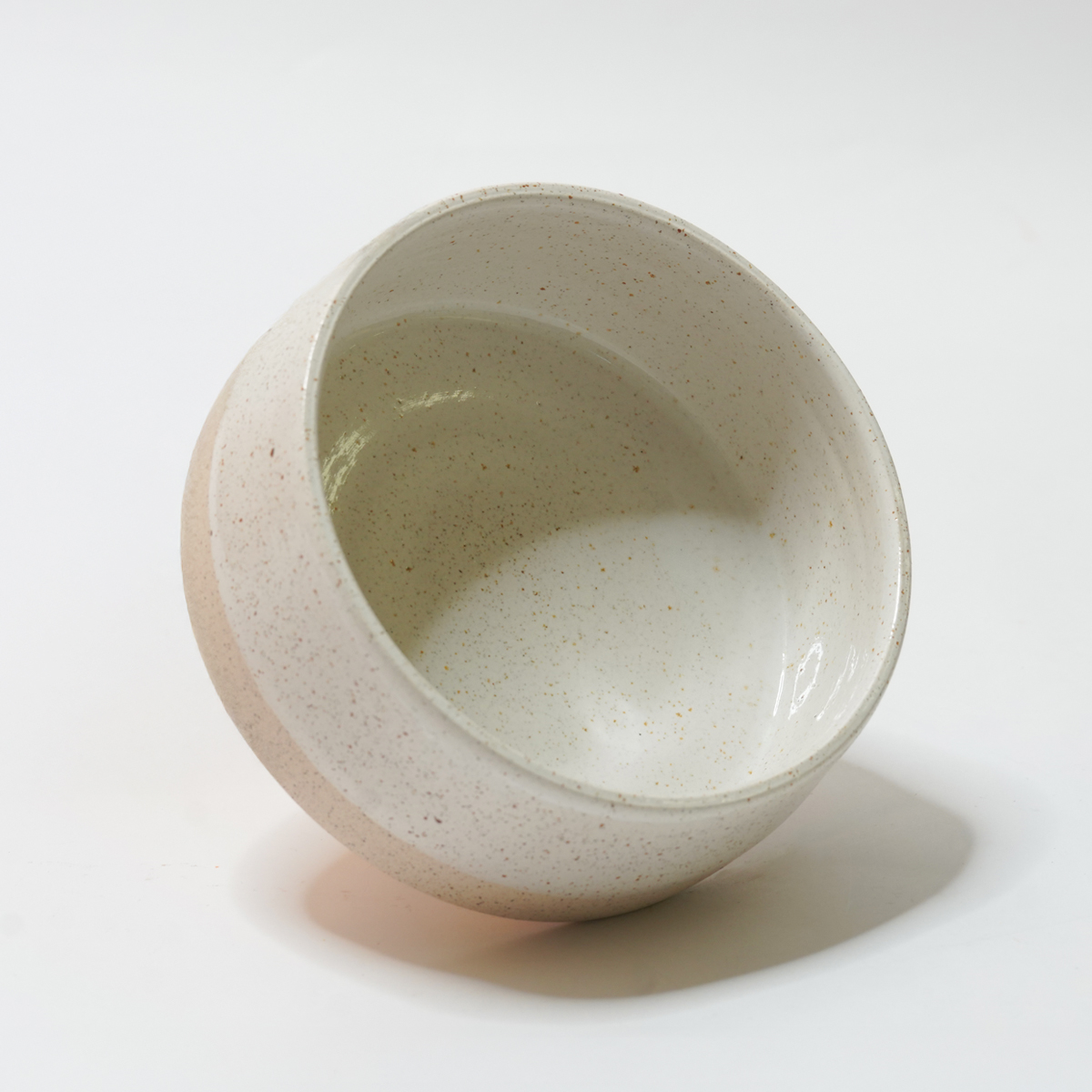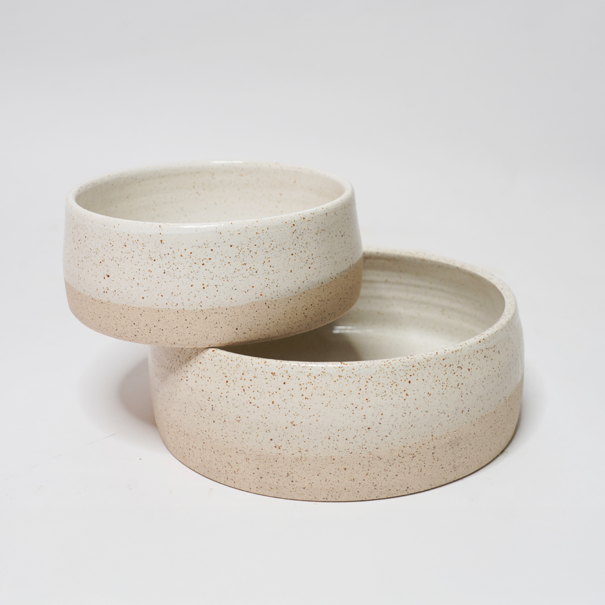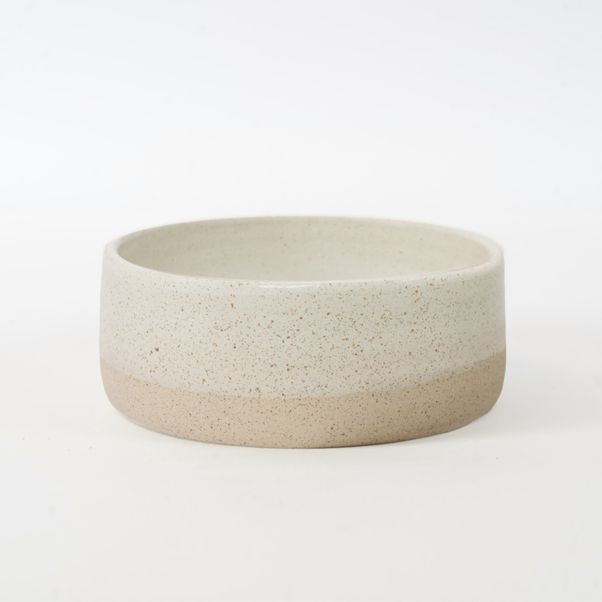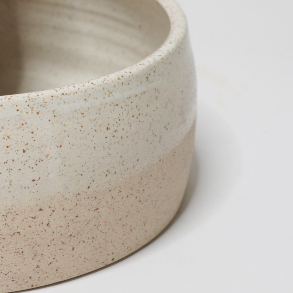 De eet- en drinkbak is gedraaid van een spikkelklei en voorzien van een wit glazuur.