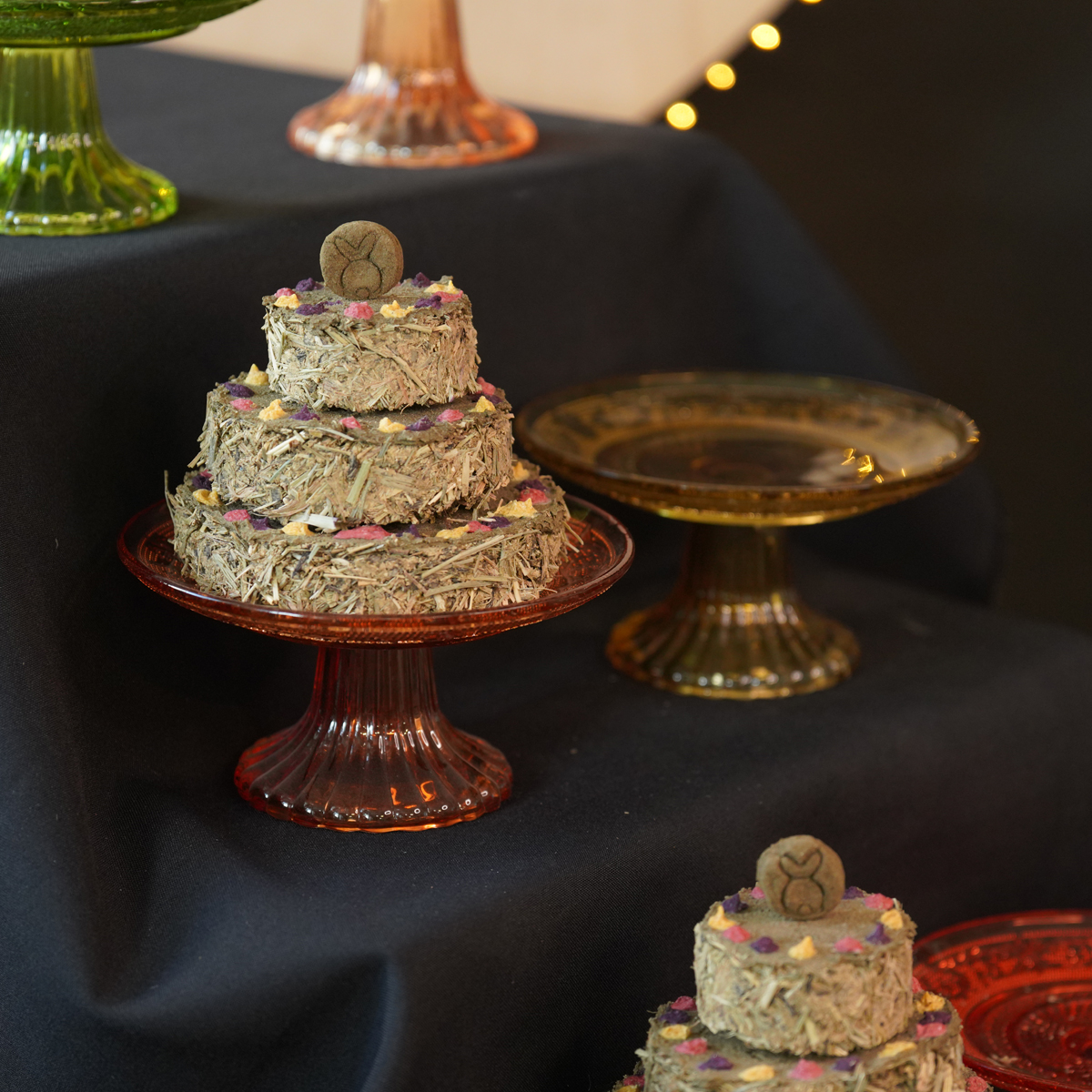 Een prachtig donker oranje plateau met daarop een heerlijke taart van hooi en weegbree. Versierd met vrolijke confetti in de smaken aardbei, mango en blauwe bes.