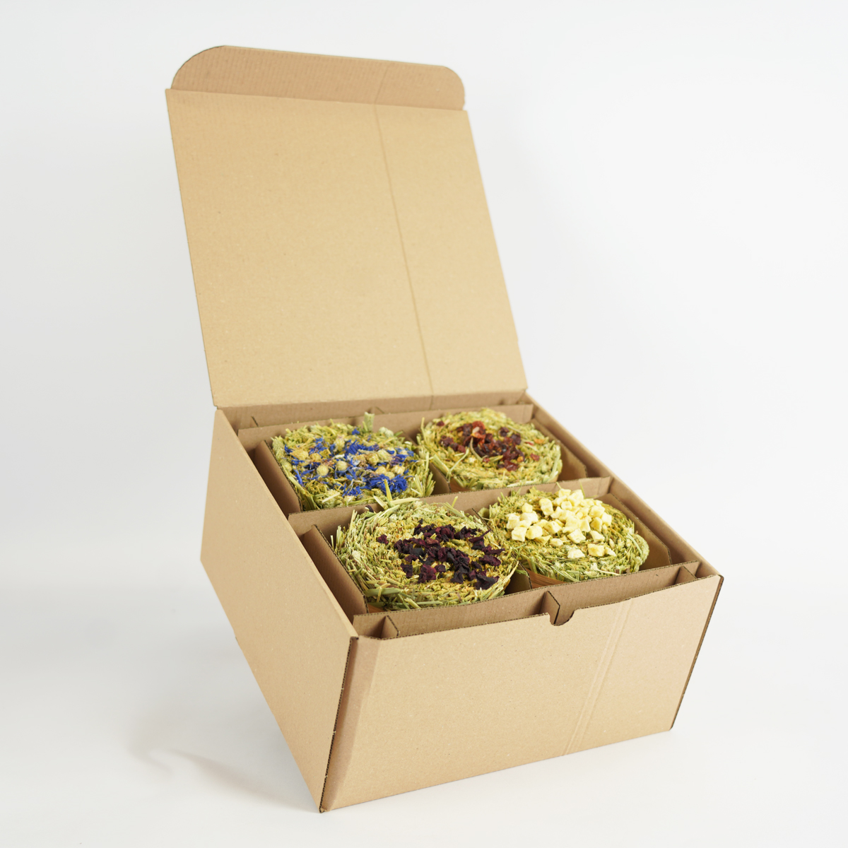 Set 1 bevat hay cakes met de topping: Appel, blauwe korenbloem, rode biet en rozenbottel