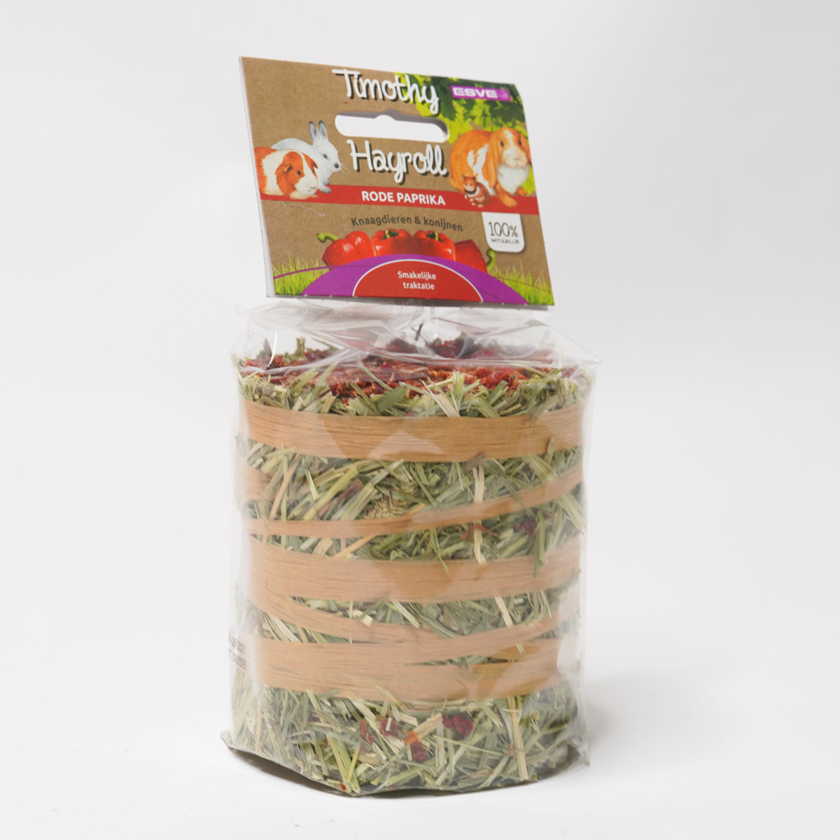Deze hay cake is een smakelijke traktatie van Timothy hooi en stukjes paprika. Leg de rol van hooi in het verblijf van jouw konijn en laat ze knabbelen, snuffelen en graven om bij de heerlijke topping te komen. Hiermee stimuleer je het natuurlijke gedrag van jouw konijn en voorkom je verveling.