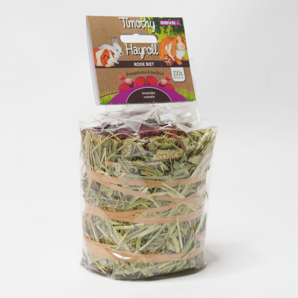 Deze hay cake is een smakelijke traktatie van Timothy hooi en stukjes rode biet. Leg de rol van hooi in het verblijf van jouw konijn en laat ze knabbelen, snuffelen en graven om bij de heerlijke topping te komen. Hiermee stimuleer je het natuurlijke gedrag van jouw konijn en voorkom je verveling.