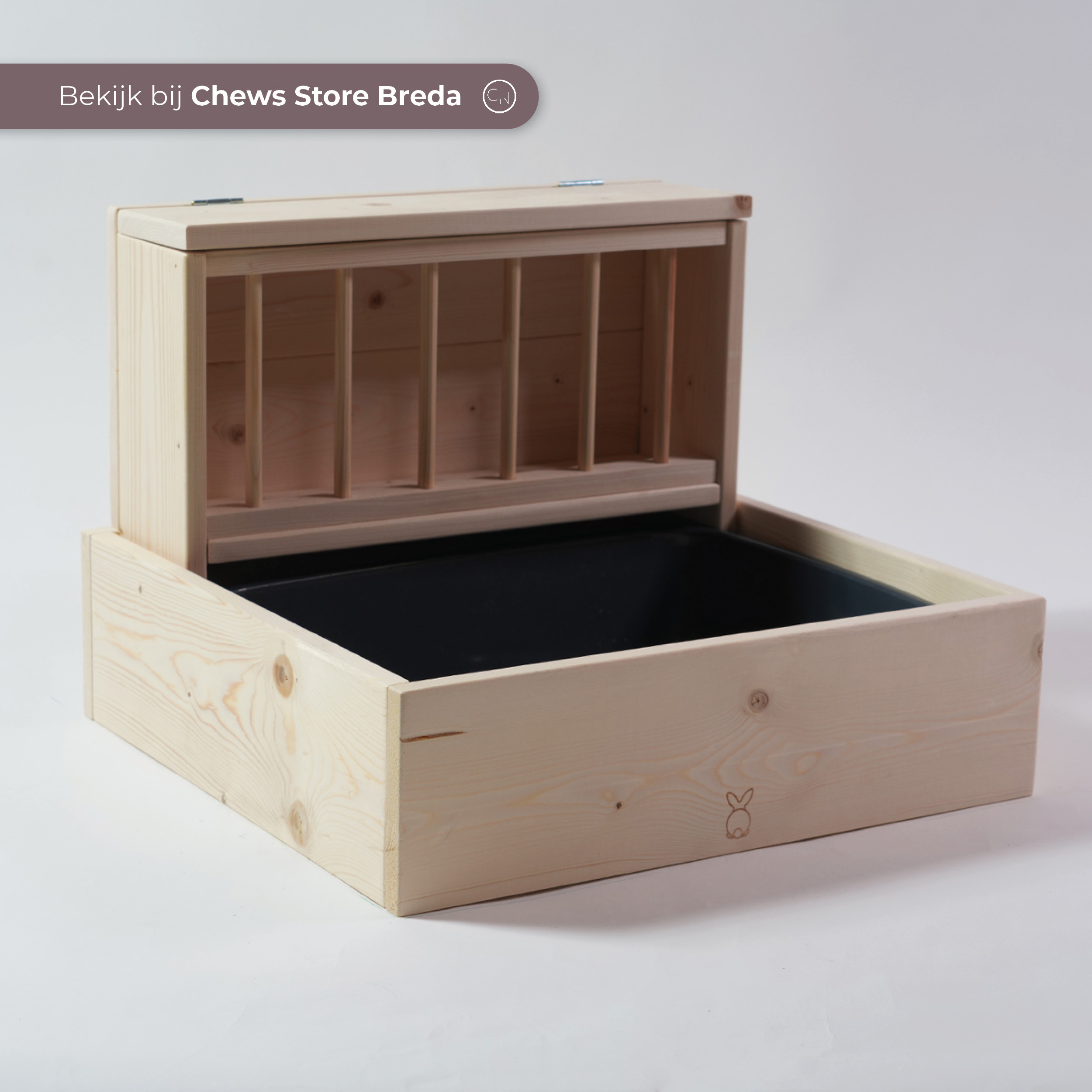 Hooiruif freya is een houten hooiruif voor jouw konijn! Door de ombouw bij het hooiruif blijft de toiletbak op zijn plek en ziet het er ook nog eens mooi uit in het verblijf. Het onbewerkte hout is veilig voor konijnen.