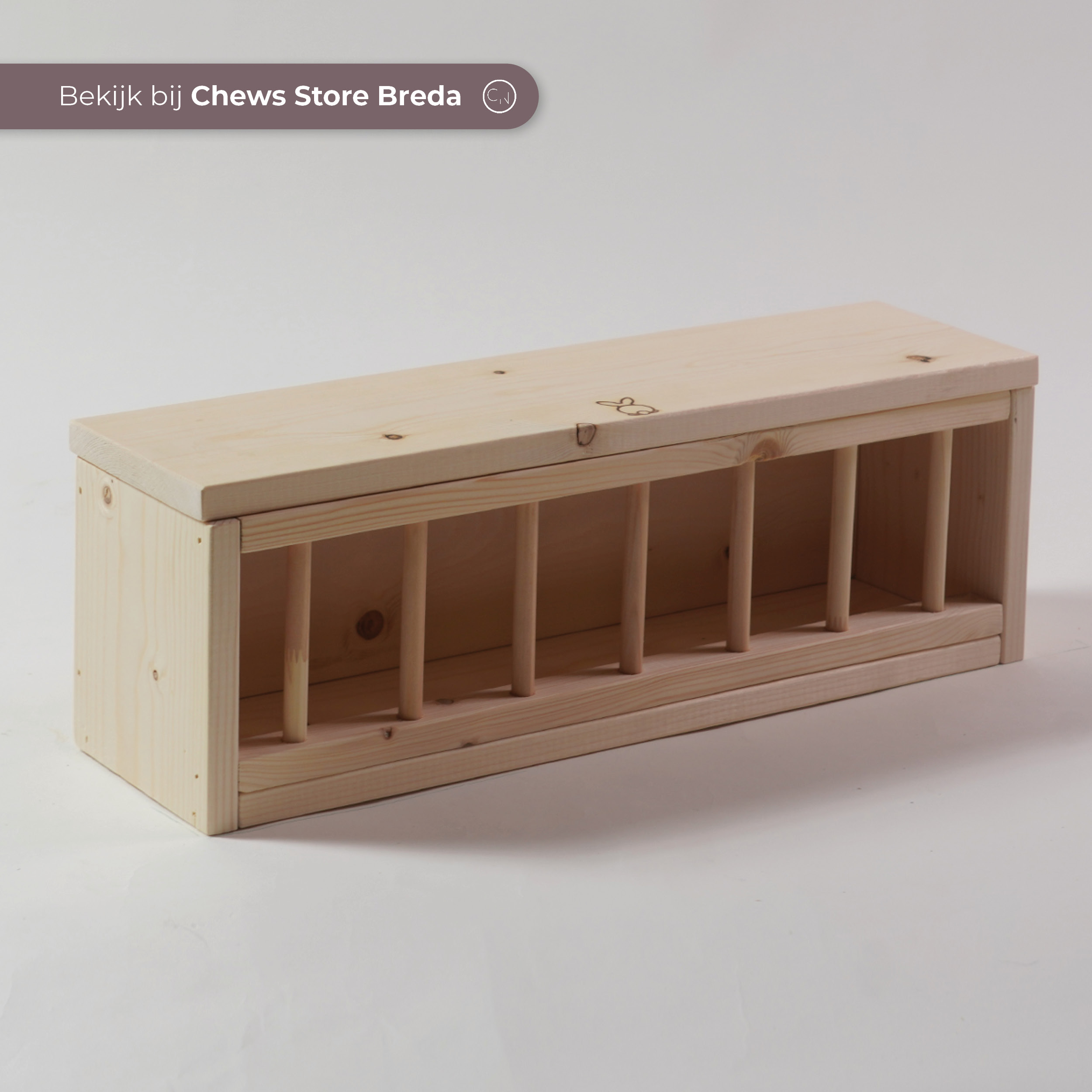 Dit hooiruif wordt in ons atelier gemaakt. Het hout dat wordt gebruikt is onbewerkt vuren en daarmee veilig voor jouw konijn. Wij kiezen er bewust voor om geen knaagstrips te plaatsen, omdat de coating in het ijzer/aluminium giftig is voor konijnen.