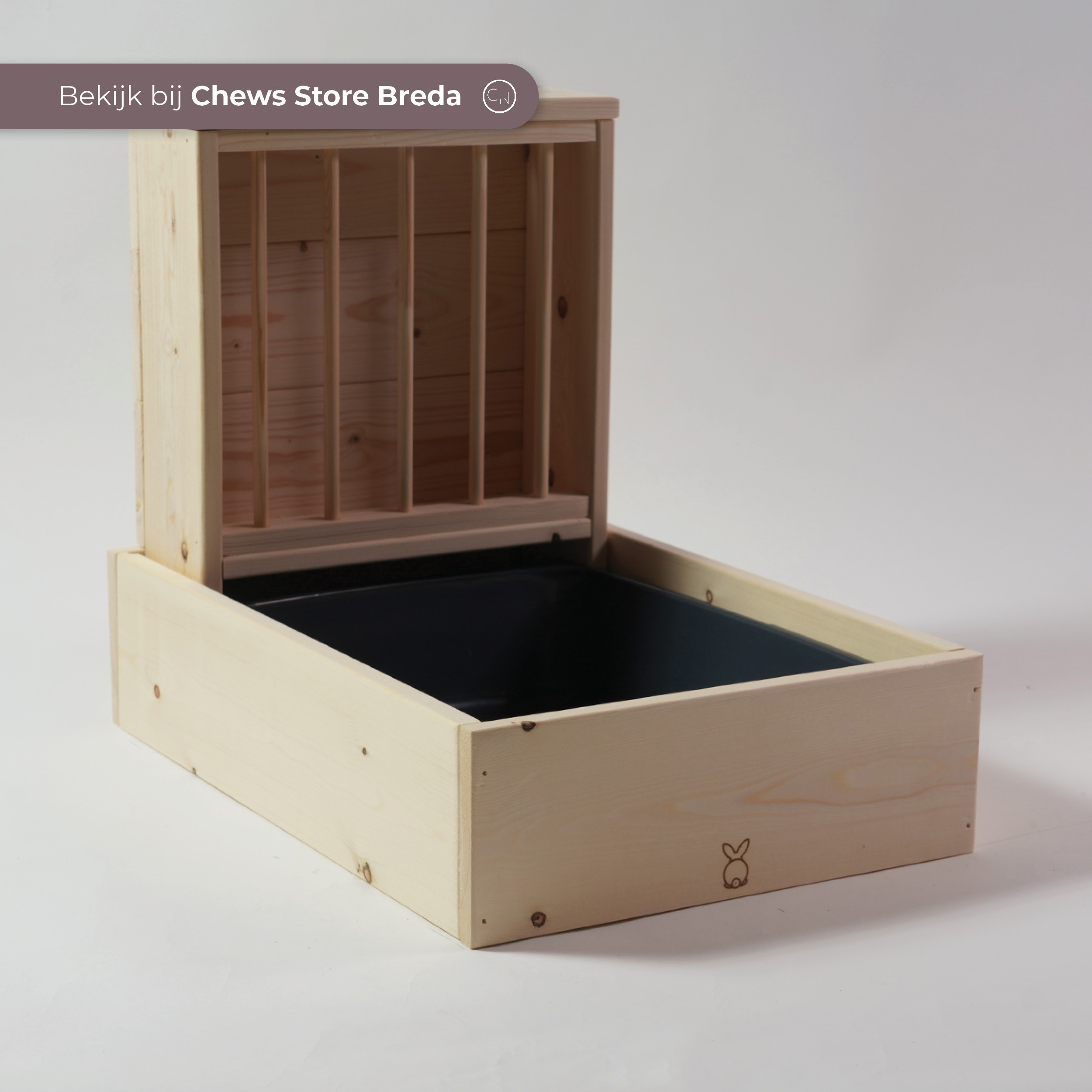 Hooiruif odin is een houten hooiruif voor jouw konijn! Door de ombouw bij het hooiruif blijft de toiletbak op zijn plek en ziet het er ook nog eens mooi uit in het verblijf. Het onbewerkte hout is veilig voor konijnen.