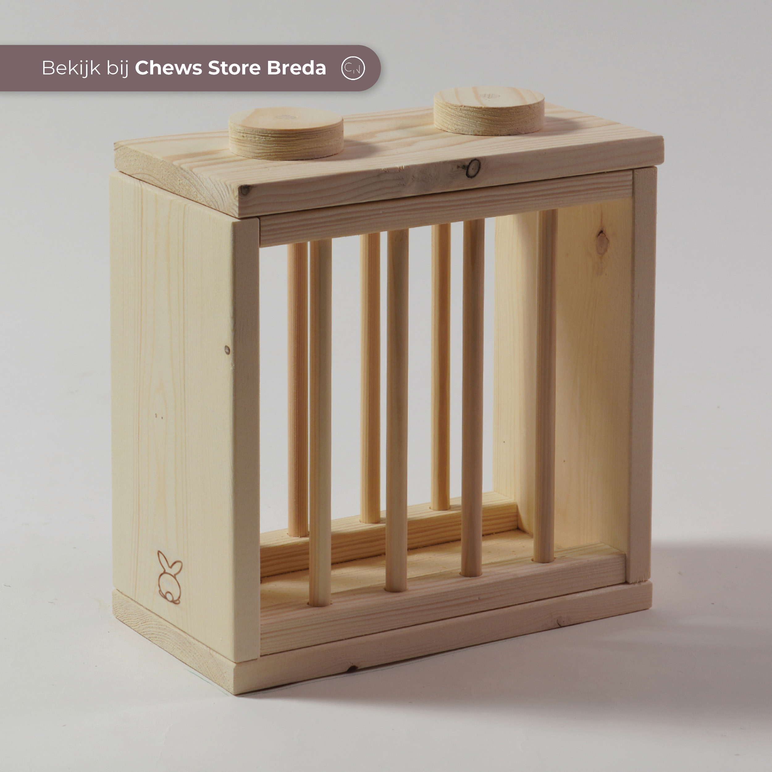 Hooiruif Skadi is een staand houten hooiruif voor jouw konijn! Gebruik je creativiteit, want deze ruif is modulair met andere atelier producten. Vul het hooiruif makkelijk via de klep aan de bovenzijde en jouw konijn kan aan twee zijden knabbelen aan hooi! Het onbewerkte hout is veilig voor konijnen.