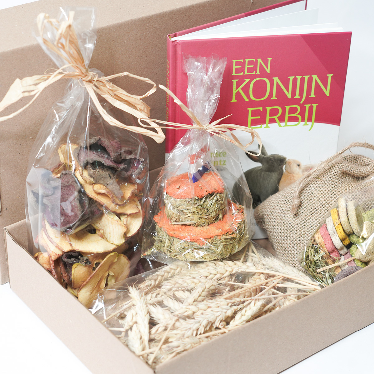 Meld je aan voor de Jouw Konijn knabbelbox en ontvang iedere maand een box vol geluk! De knabbelbox wordt iedere maand samengesteld door onze interne konijnendeskundigen. Zo weet je zeker dat alles in de box gezond en veilig is voor jouw konijn!