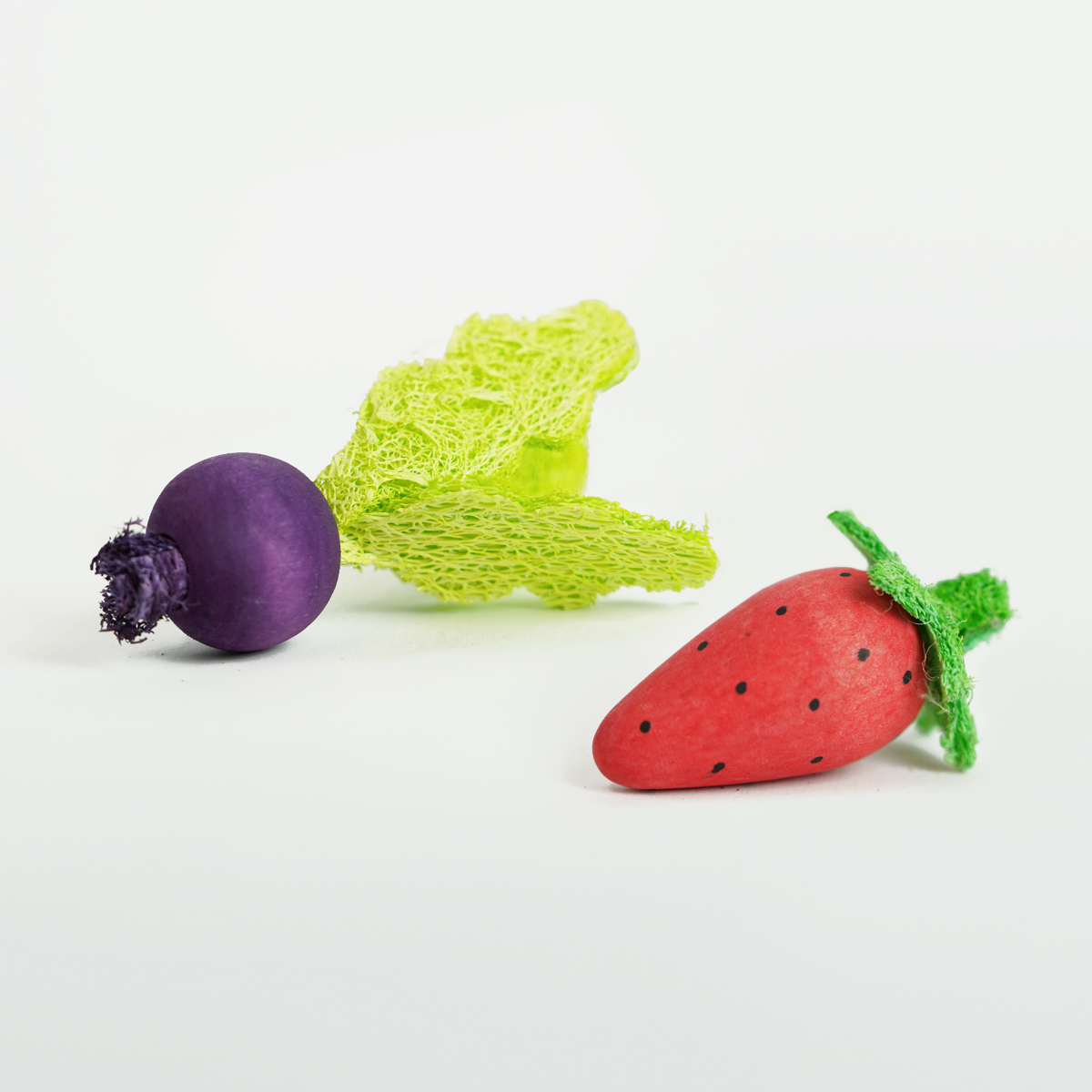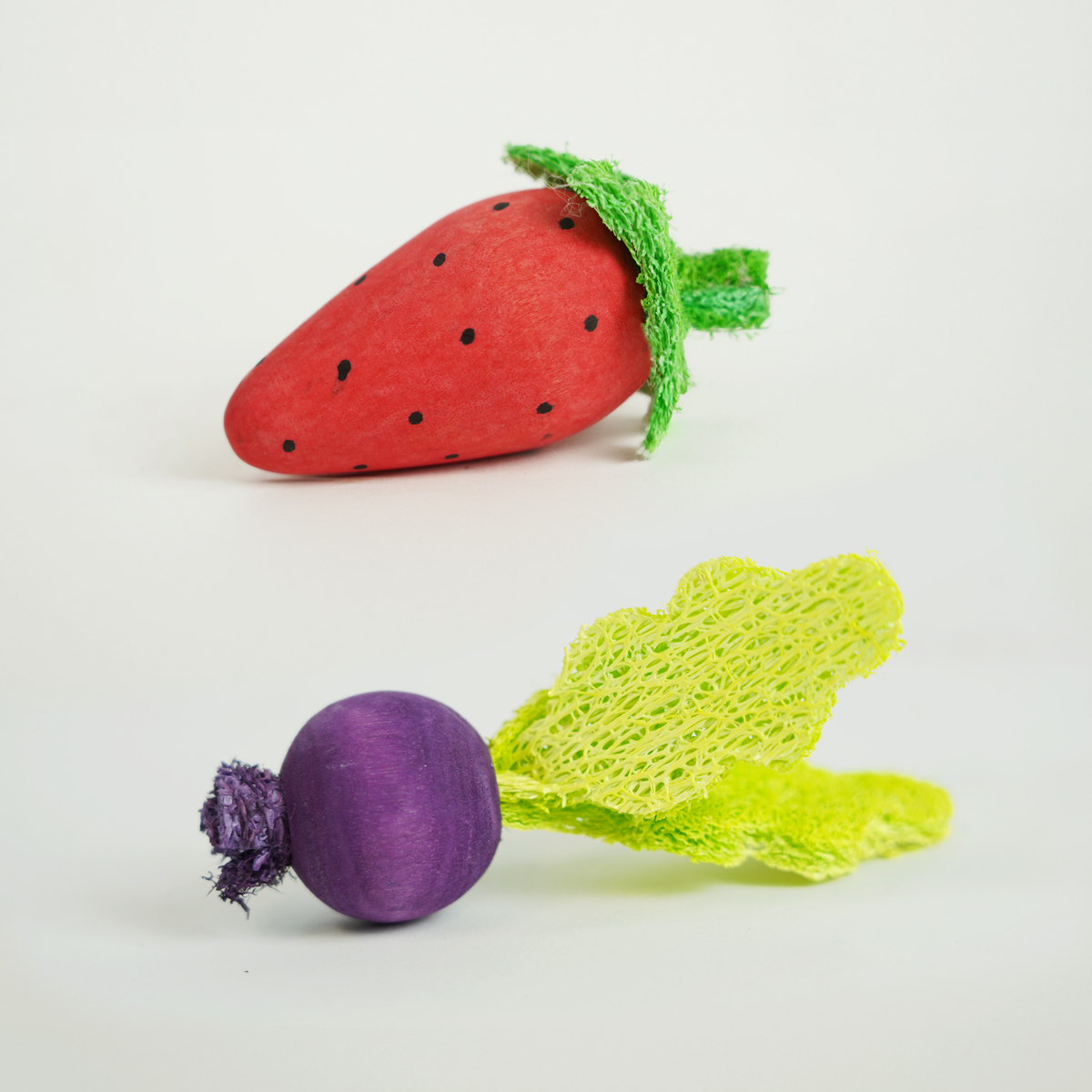 De Knabbelspeeltjes zijn gemaakt van 100% natuurlijke materialen, namelijk hout en loofah.