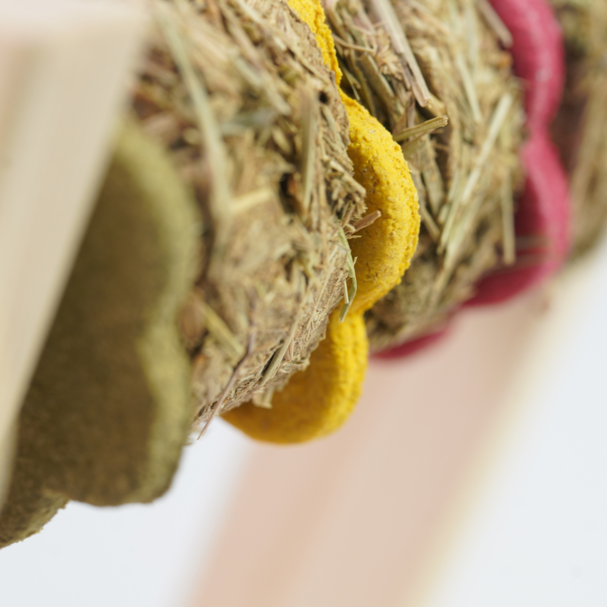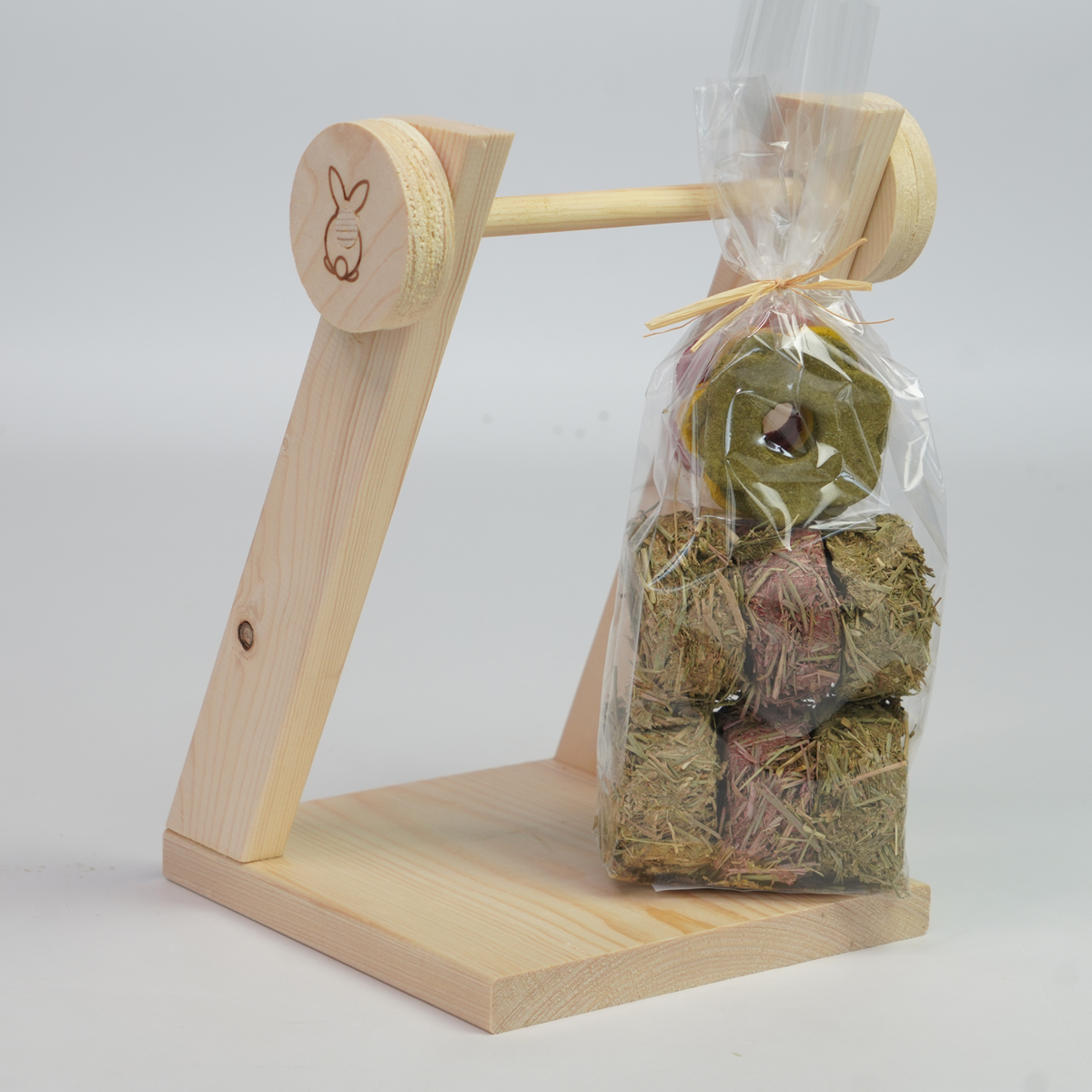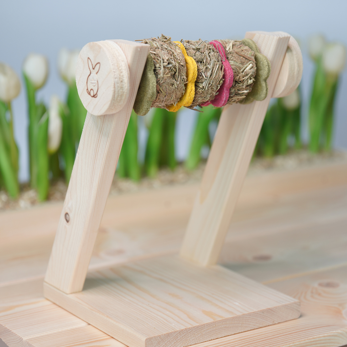 Deze tower is speciaal gemaakt voor onze zeer geliefde hay rondo’s en cookies. De hay rondo’s en koekjes zijn gemaakt met een gat, zodat je deze in het houten spel kunt bevestigen. Zo kan jouw konijn heerlijk spelen, draaien en ondertussen ook nog genieten van de hooi schijven en koekjes, gemaakt van hooi en wortel, spinazie en rode biet.