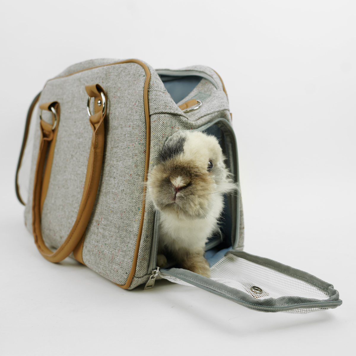 De reistas is aan de binnenkant gevoerd met een schapenvacht look. Je kan de tas openen aan de boven- en zijkant, waardoor je makkelijk je konijn in de tas kan plaatsen. Aan de zijkant vind je een afdekbaar gaasinzetstuk.
