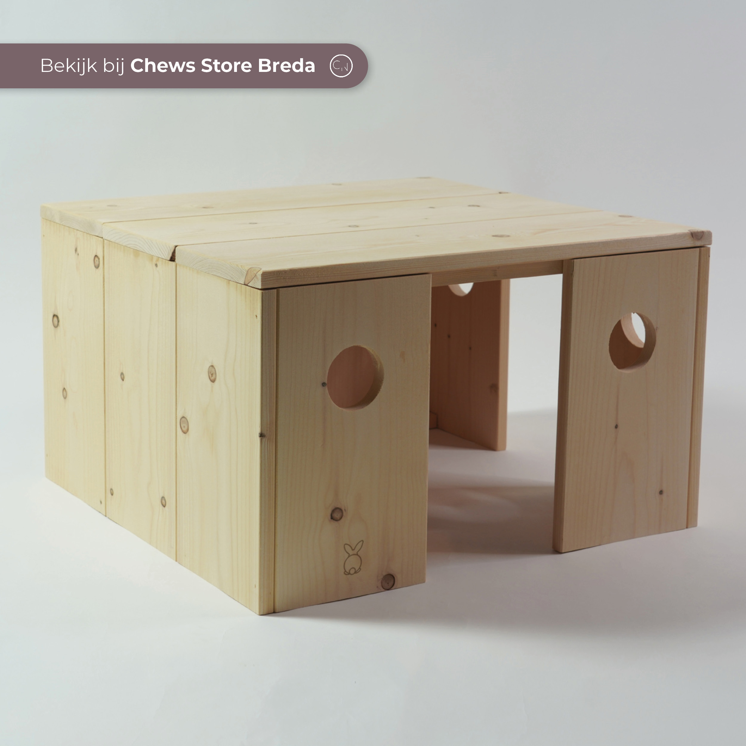Dit schuilhuis wordt in ons atelier gemaakt. Het hout dat wordt gebruikt is onbewerkt vuren en daarmee veilig voor jouw konijn. Wij kiezen er bewust voor om geen knaagstrips te plaatsen, omdat de coating in het ijzer/aluminium giftig is voor konijnen.
