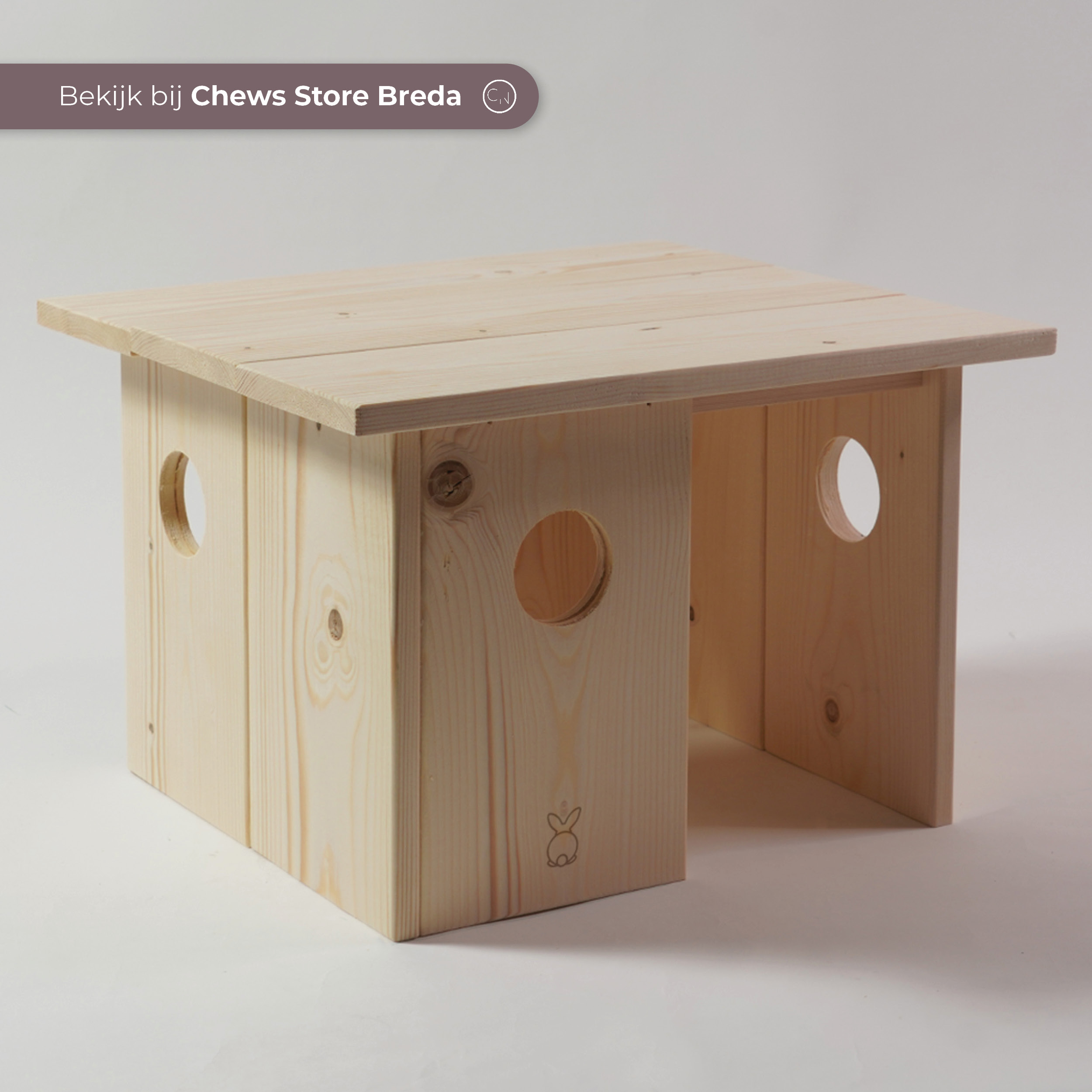 Schuilplek Syn is een houten schuilplek voor jouw konijn! Door het neutrale uiterlijk past deze schuilplek in ieder verblijf. Het onbewerkte hout is veilig voor konijnen.