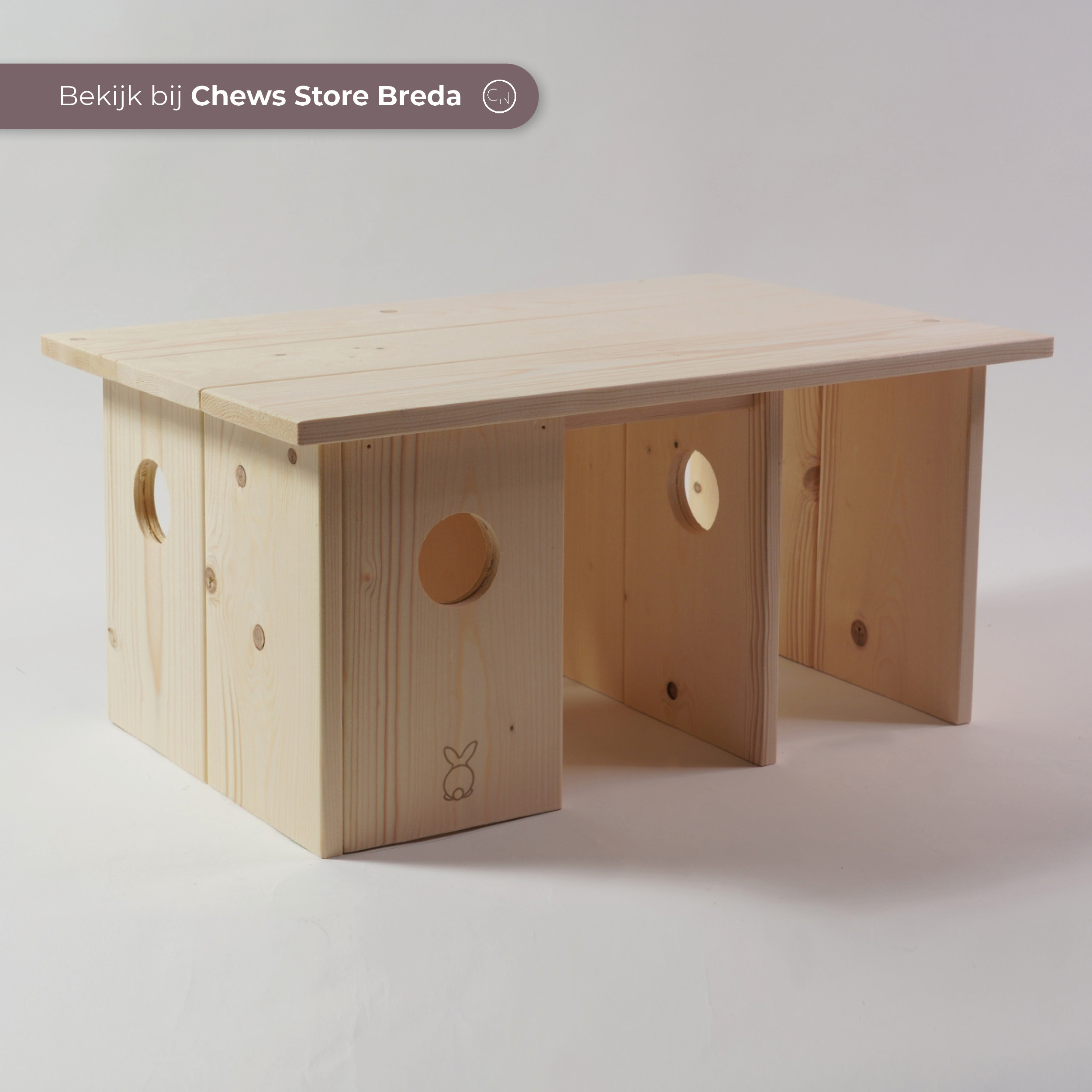 Deze schuilplek wordt in ons atelier gemaakt met de hand. Het hout dat wordt gebruikt is onbewerkt vuren en daarmee veilig voor jouw konijn. Wij kiezen er bewust voor om geen knaagstrips te plaatsen, omdat de coating in het ijzer/aluminium giftig is voor konijnen.