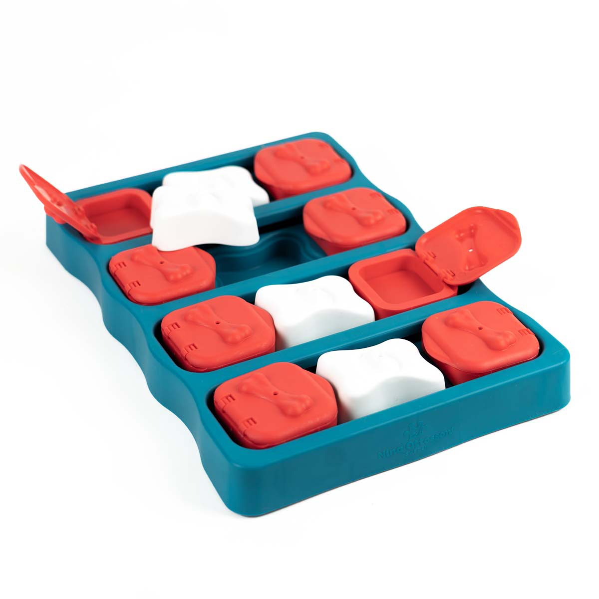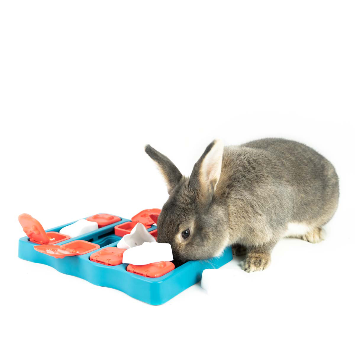 De Slide & Find is een uitdagend denkspel voor jouw konijn! Door de klepjes te openen en de dopjes op te tillen, kan jouw konijn bij alle verstopte beloningen komen.