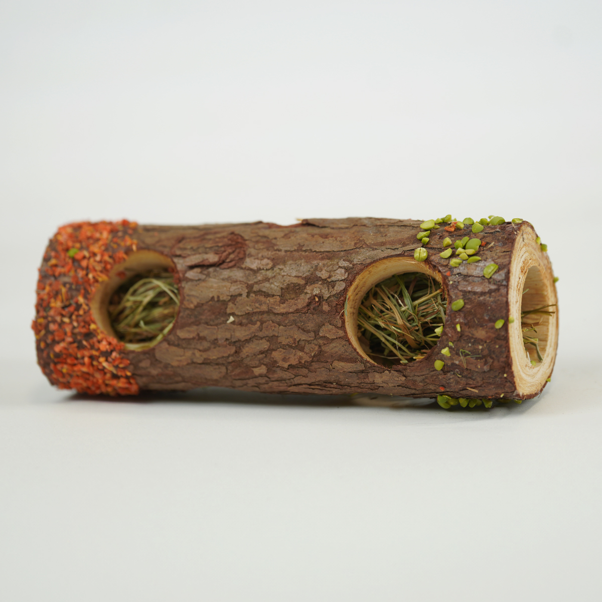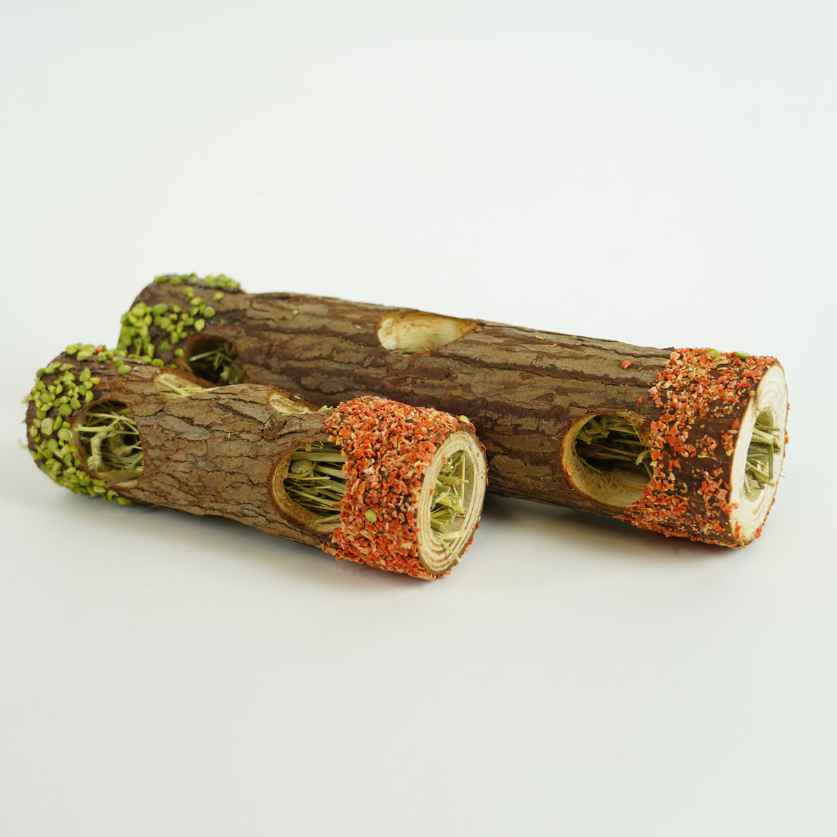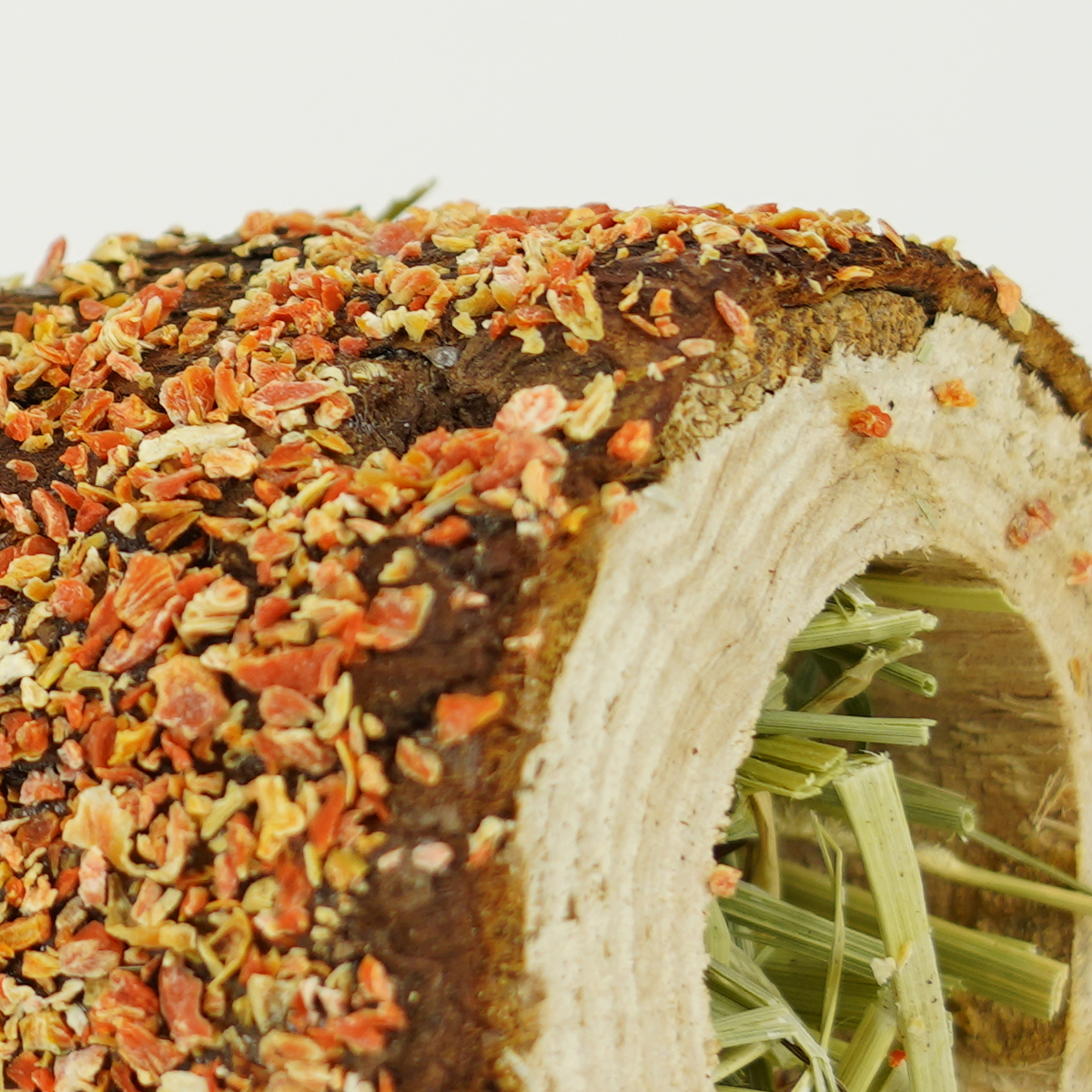 De snackstam is gevuld met hooi en bekleed met hibiscusbloesem, wortel en erwten. Jouw konijn kan heerlijk knabbelen aan deze snackrol. De stam kan opnieuw gevuld worden met hooi, kruiden en snacks.