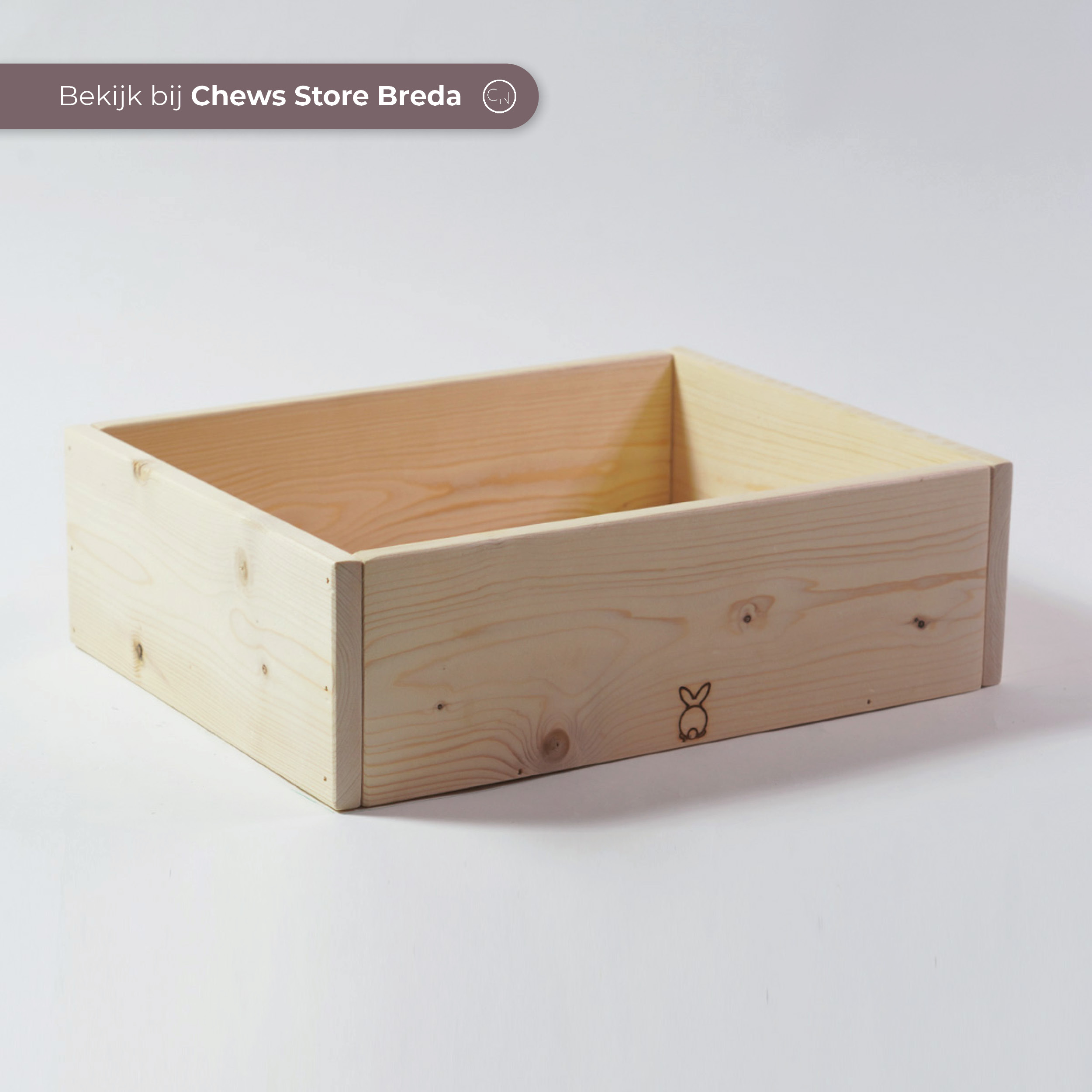 Deze snuffelbak wordt in ons atelier gemaakt. Het hout dat wordt gebruikt is onbewerkt vuren en daarmee veilig voor jouw konijn. Wij kiezen er bewust voor om geen knaagstrips te plaatsen, omdat de coating in het ijzer/aluminium giftig is voor konijnen.