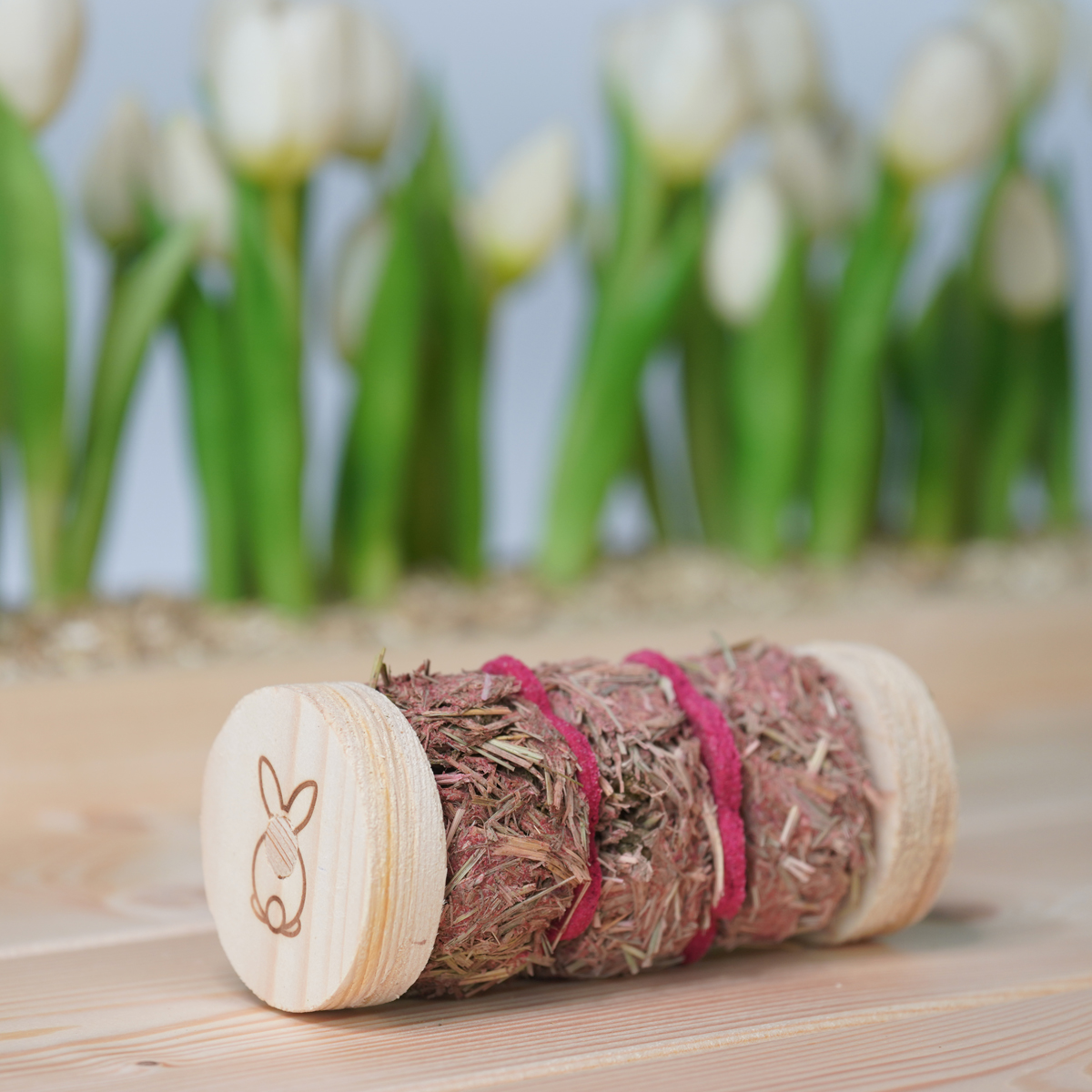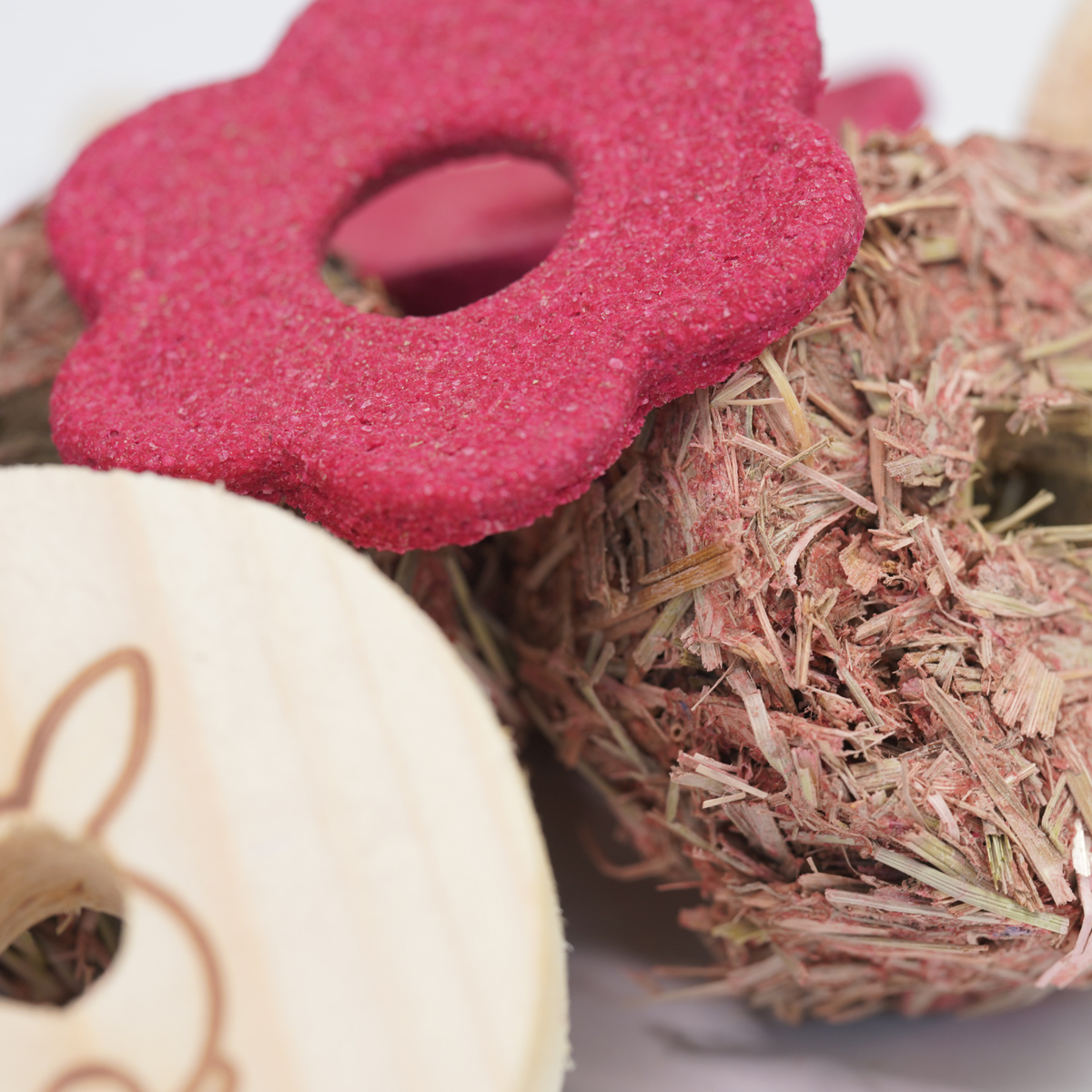Deze toy is speciaal gemaakt voor onze zeer geliefde hay rondo’s en cookies. De hay rondo’s en koekjes zijn gemaakt met een gat, zodat je deze in het houten spel kunt bevestigen. Zo kan jouw konijn heerlijk spelen, gooien en ondertussen ook nog genieten van de hooi schijven en koekjes, gemaakt van hooi en rode biet.