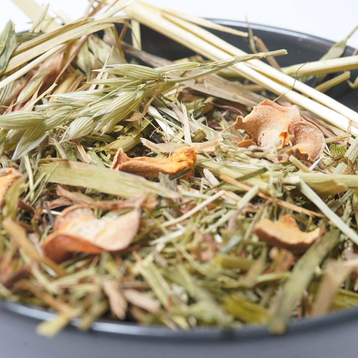 Groene haver, gras, weegbree, chicoreiwortel, gedroogde wortel, gedroogde pompoen, erwtenvlokken