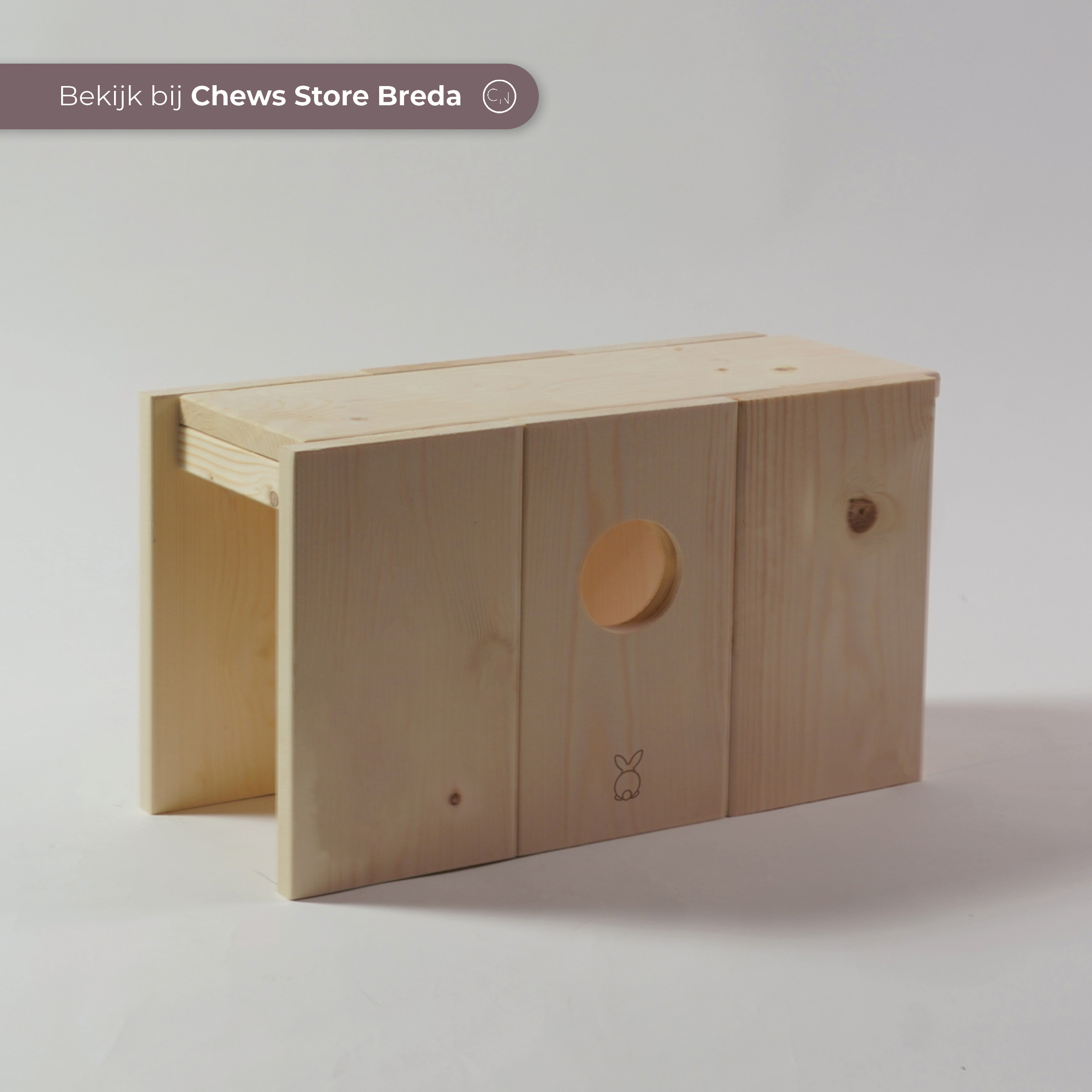 Deze tunnel wordt in ons atelier gemaakt. Het hout dat wordt gebruikt is onbewerkt vuren en daarmee veilig voor jouw konijn. Wij kiezen er bewust voor om geen knaagstrips te plaatsen, omdat de coating in het ijzer/aluminium giftig is voor konijnen.