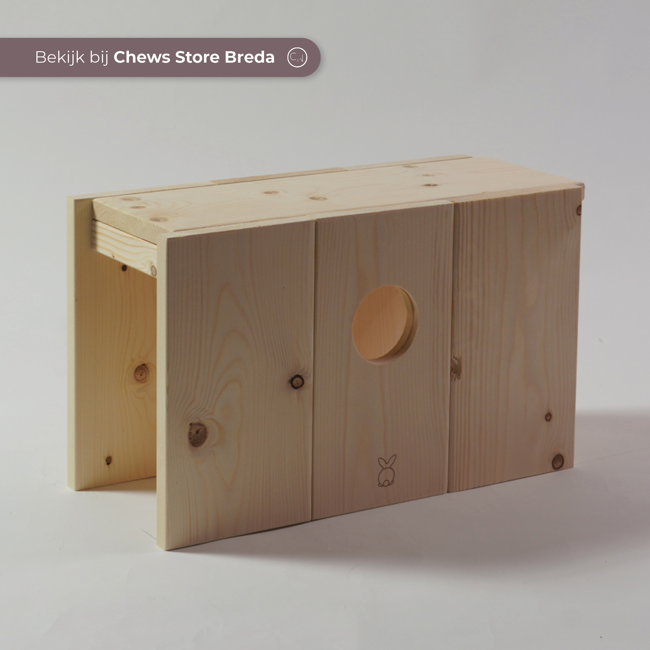 Deze tunnel wordt in ons atelier gemaakt. Het hout dat wordt gebruikt is onbewerkt vuren en daarmee veilig voor jouw konijn. Wij kiezen er bewust voor om geen knaagstrips te plaatsen, omdat de coating in het ijzer/aluminium giftig is voor konijnen.