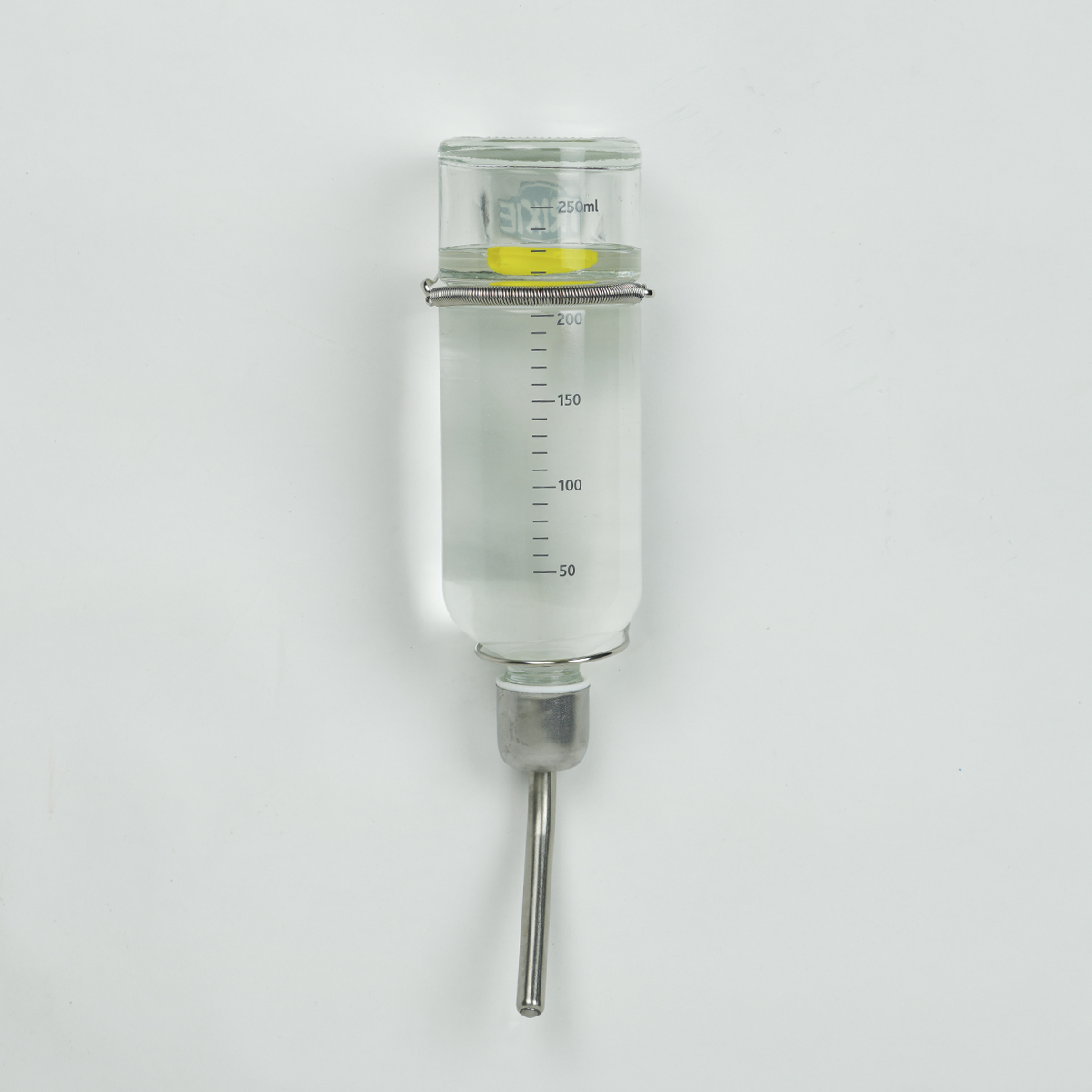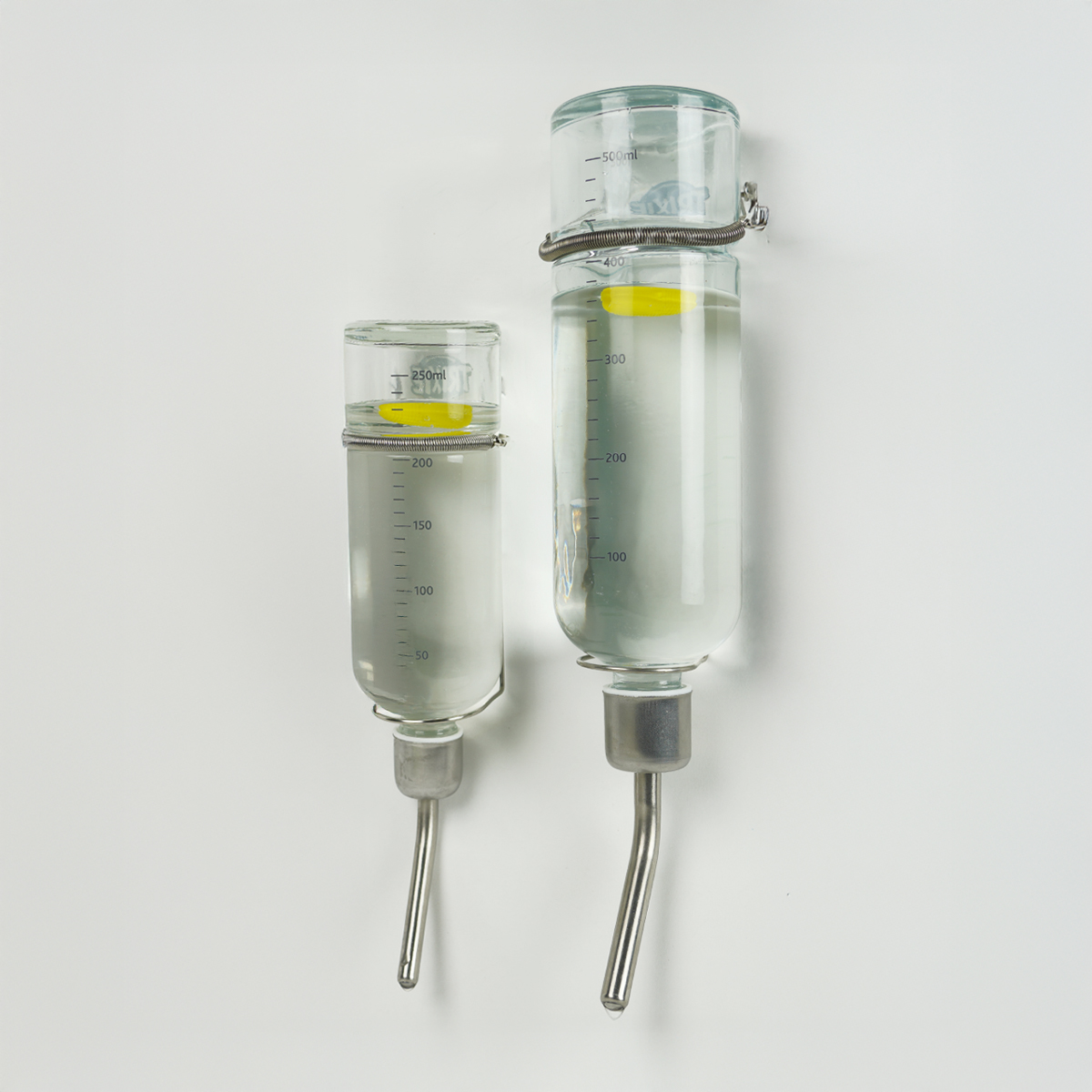 Deze glazen drinkfles is gemaakt van glas en aluminium. Bevestig hem makkelijk in het verblijf door de spanveer en draadbeugel. Jouw konijn kan drinken aan het roestvrijstalen tuitje.